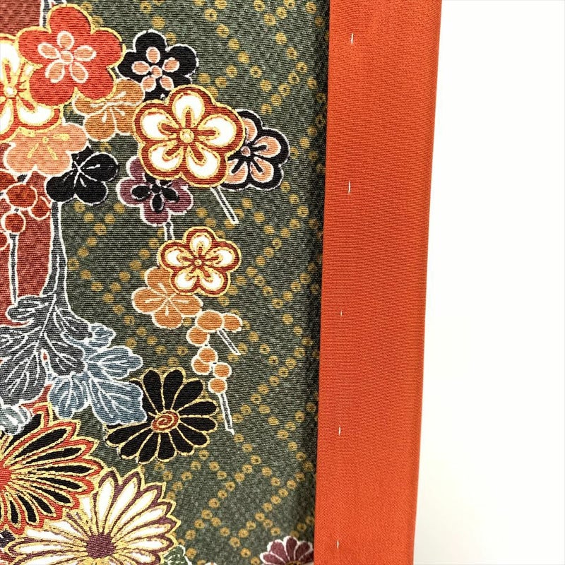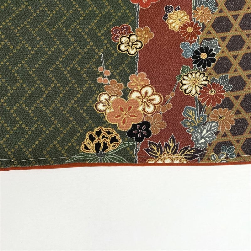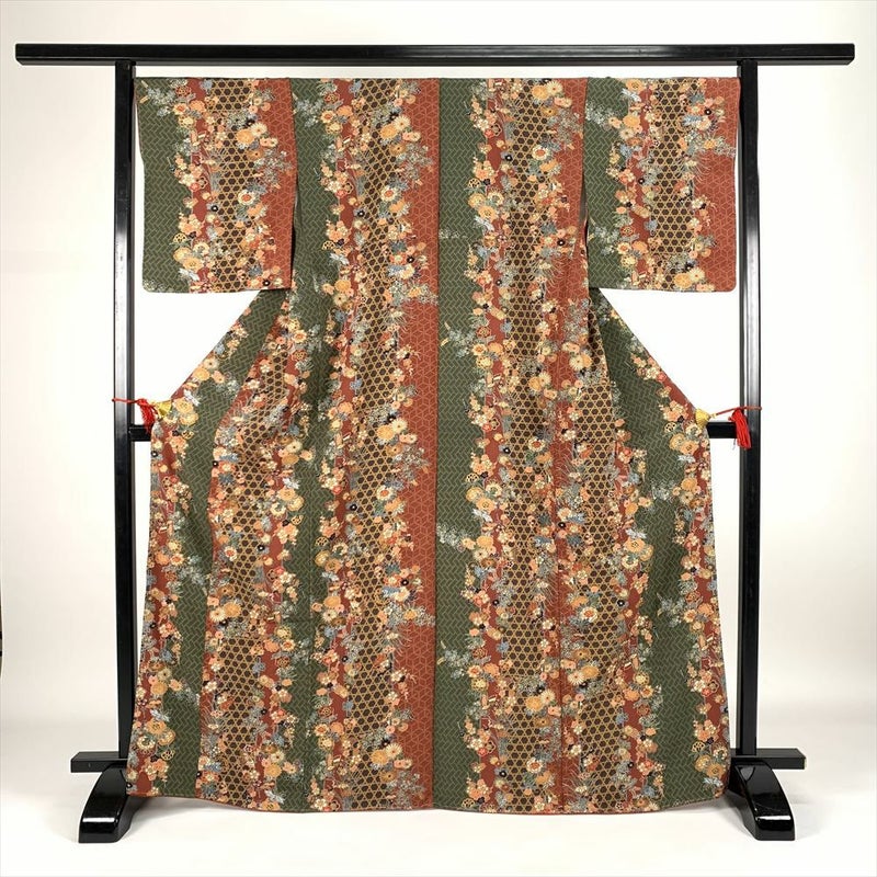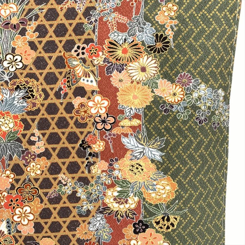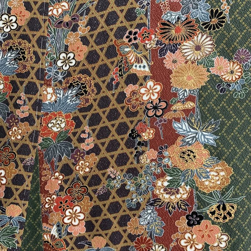 茶と緑の落ち着いた色合いに、ちりめんの優しい風合いがマッチ。梅、菊、蝶、四季花、そして籠目といった、日本の美しい四季をぎゅっと詰め込んだような柄が、着る人の魅力を引き立てます。
