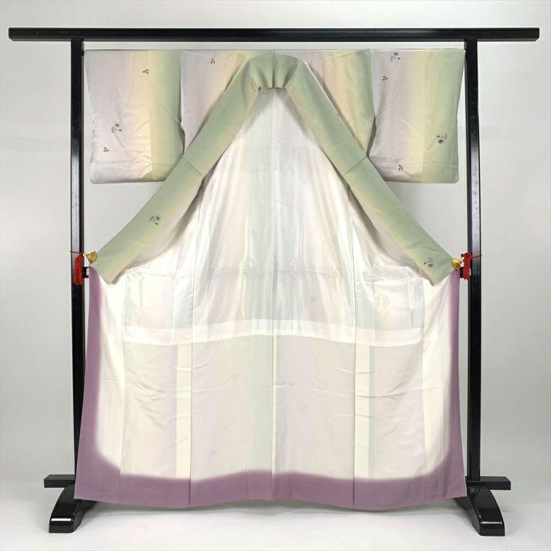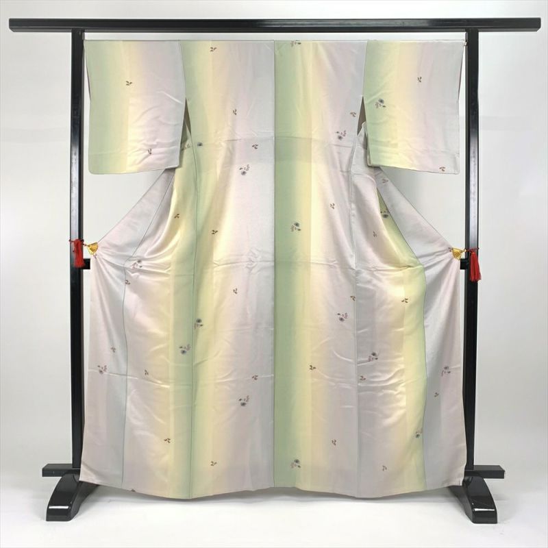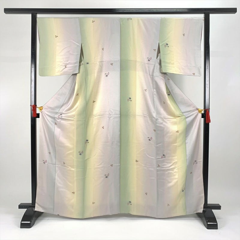 (中古)小紋 カジュアル 緑 袷 飛び柄 ぼかし 小花 縮緬 M【身丈】161cm【裄丈】67.5cm