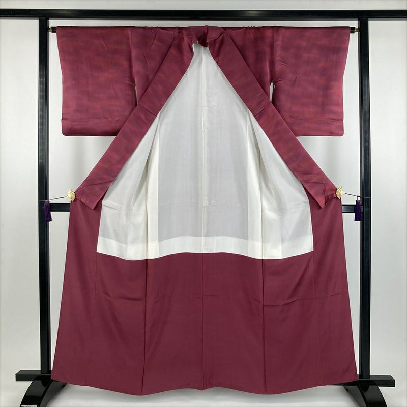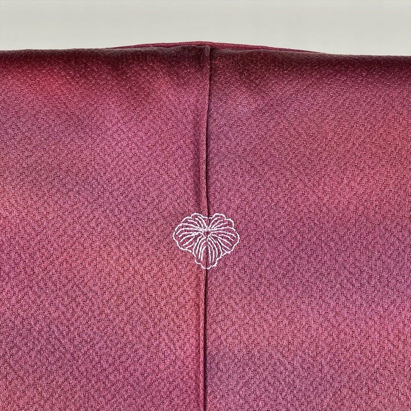 手染めのぼかし染めは、同じものが二つとない一点もの。自分だけの特別な一着として長く愛用できます。さまざまな色や柄の帯と合わせやすく、カジュアルからフォーマルな場まで、幅広いシーンで活躍します。その深みのある色合いは、 赤色と紫色の華やかさを合わせ持ち、高貴でエレガントなイメージ、特別な日に着たい着物です。状態の良い美品。クリーニング済みで、すぐにご着用いただけます。保存臭がややございます。一つ紋
