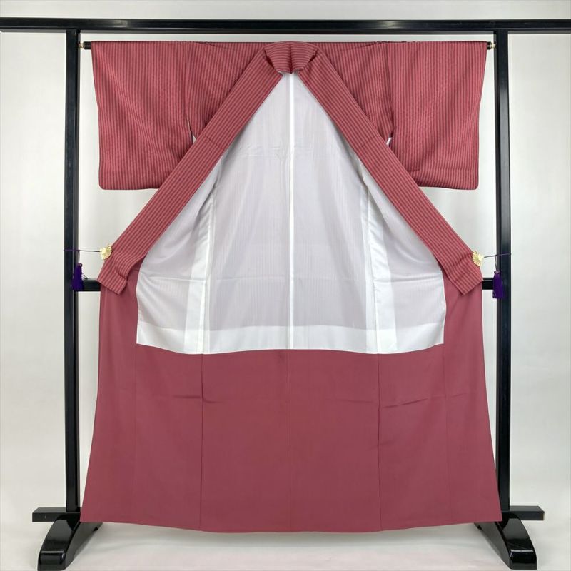 (中古)小紋 紅梅色 ピンク 薄茶 カジュアル 地紋織り 染め 縞 袷 S【身丈】159cm【裄丈】64.5cm