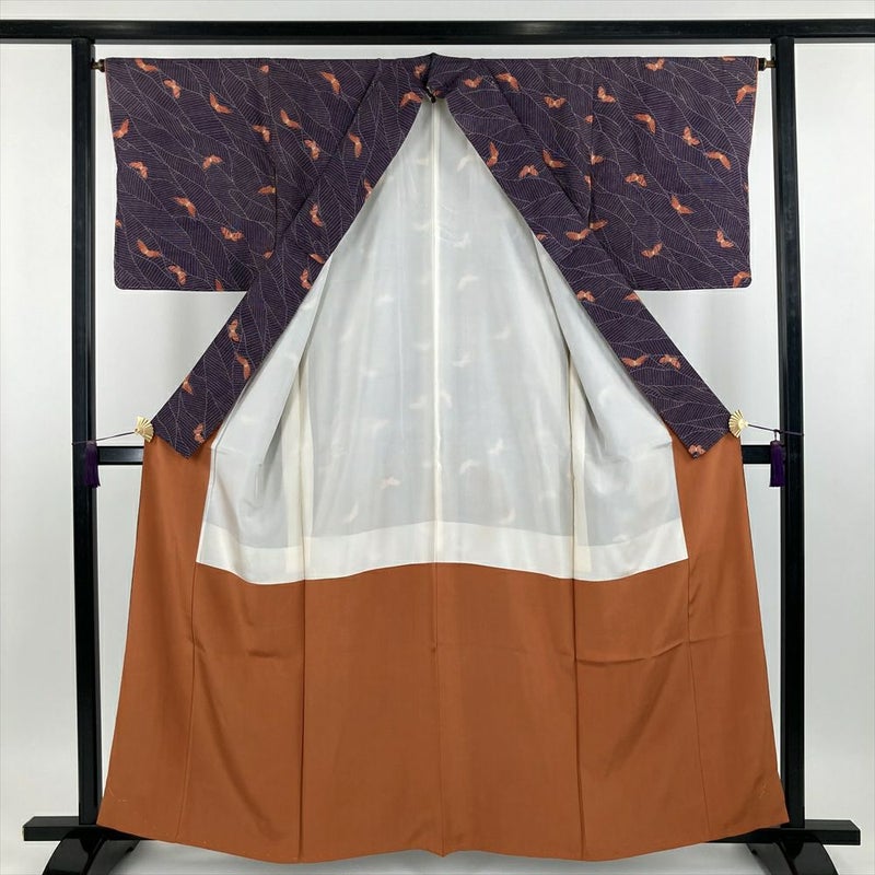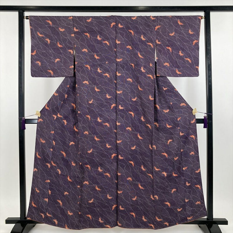 (中古) 小紋 紫色 カジュアル 地紋織り 染め 蝶 袷【身丈】155cm【裄丈】65.5cm