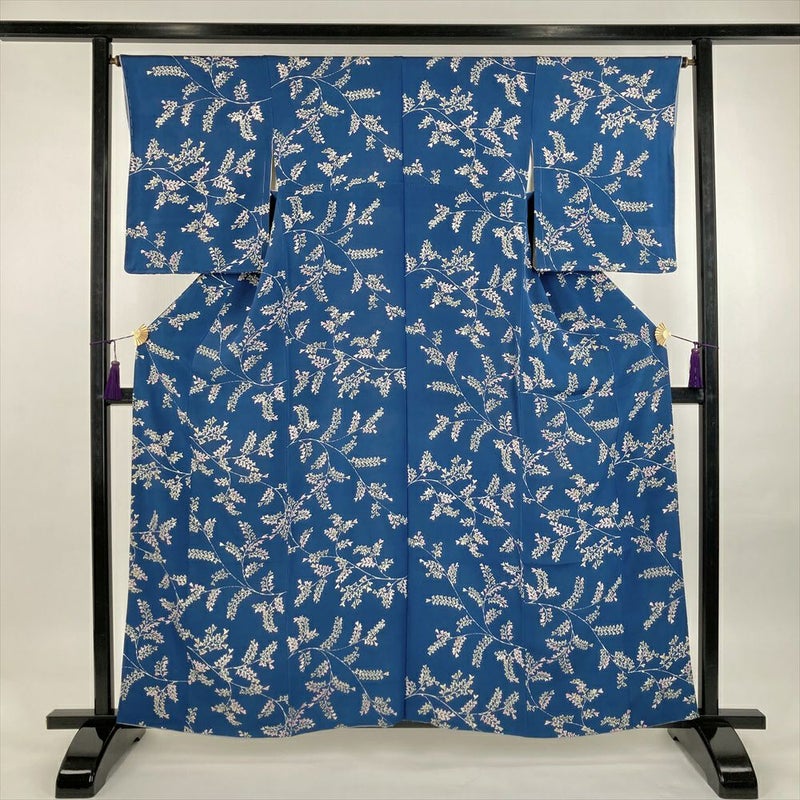 (中古) 小紋 藍色 青 カジュアル ちりめん 型絵染め 植物 袷 S【身丈】157.5cm【裄丈】66cm