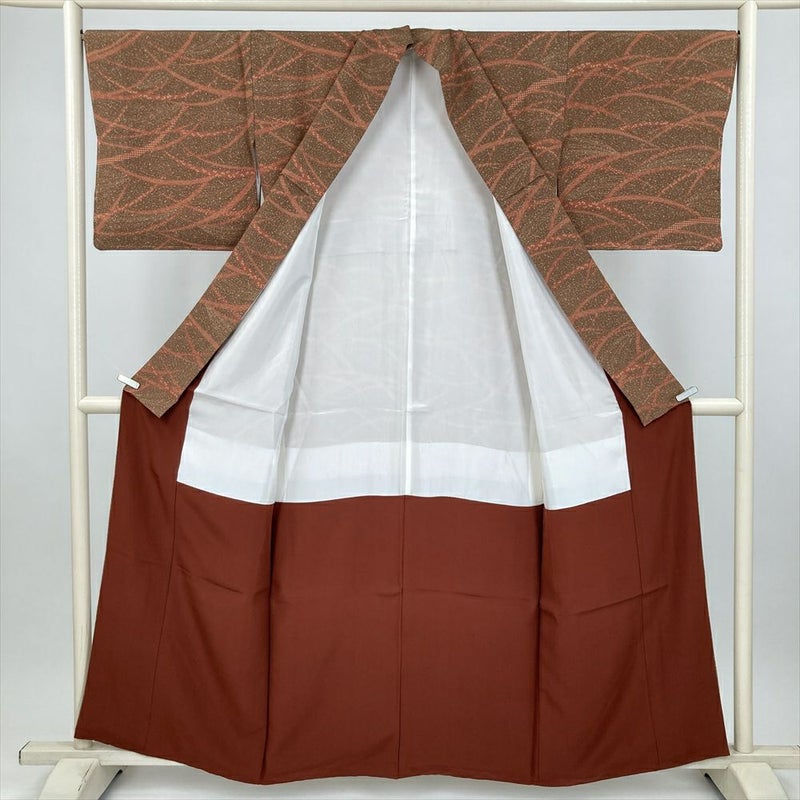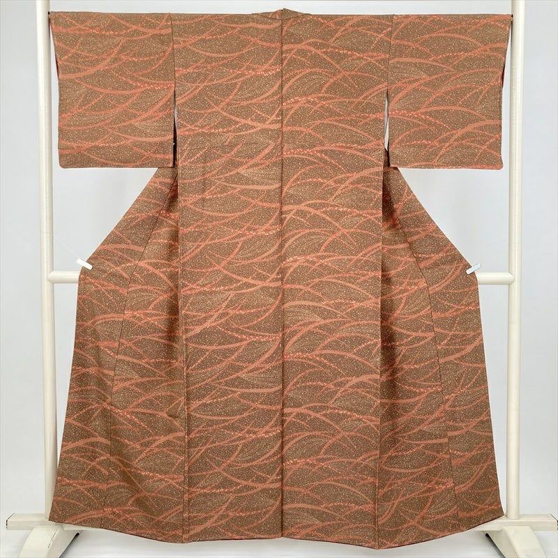 (中古) 小紋 茶 カジュアル 縮緬 露芝 吉祥文 たたき染め 袷 絹【身丈】153cm【裄丈】68cm