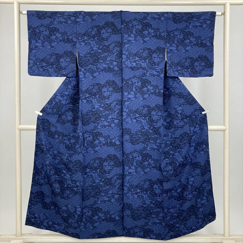 (中古) 小紋 紺 青 カジュアル 花草 吉祥文 袷 絹【身丈】148cm【裄丈】62.5cm