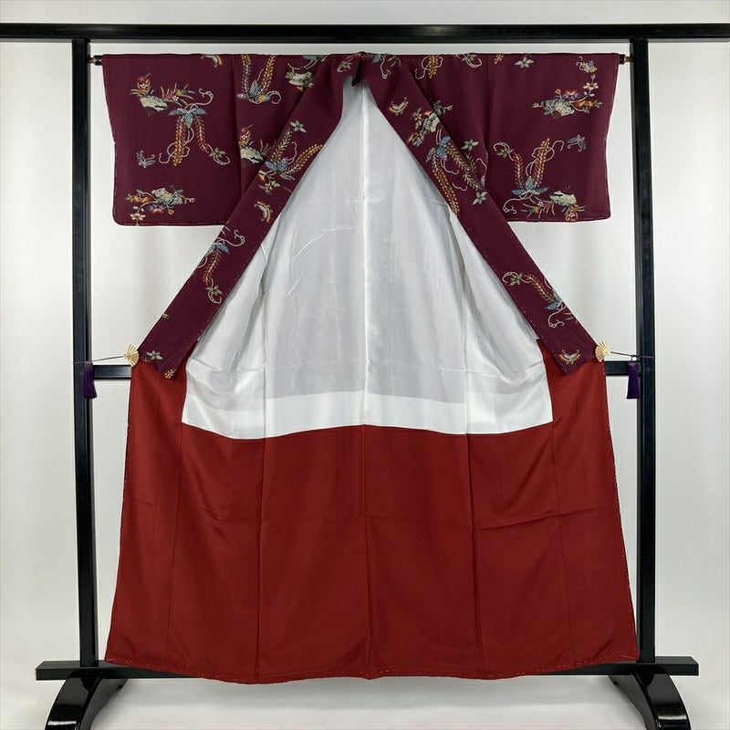 (中古) 小紋 赤紫 小豆色 カジュアル ちりめん 染め 花鳥 袷【身丈】153cm【裄丈】65cm