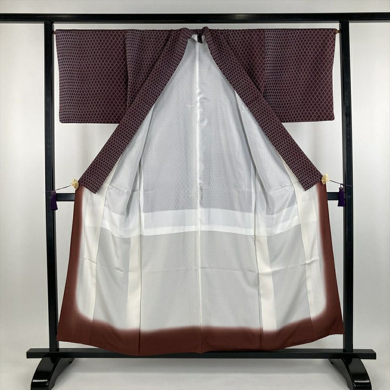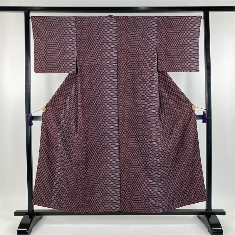 (中古) 小紋 赤紫 小豆色 カジュアル ちりめん 染め 七宝繋ぎ 袷【身丈】148.5cm【裄丈】66.5cm