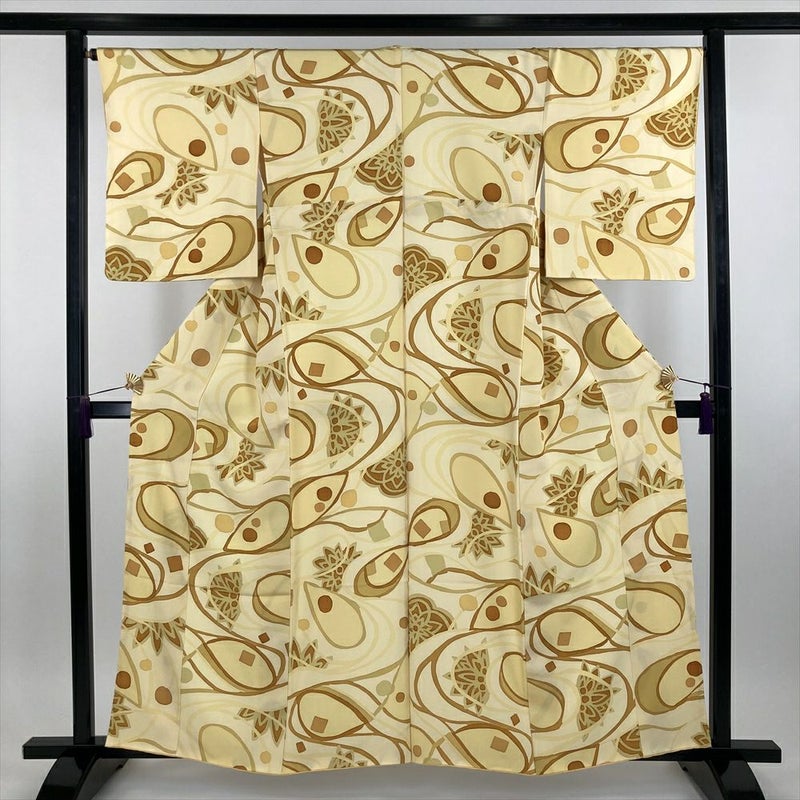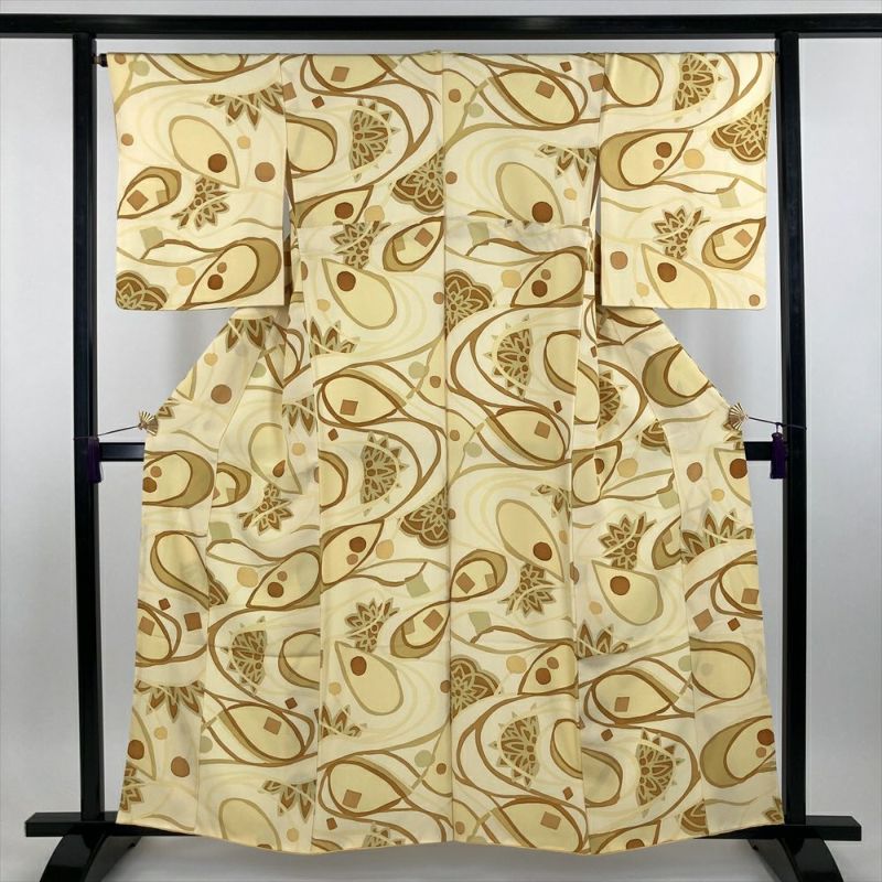 (中古) 小紋 黄色 卵色 カジュアル ちりめん 染め 流線に花 袷【身丈】153.5cm【裄丈】67cm