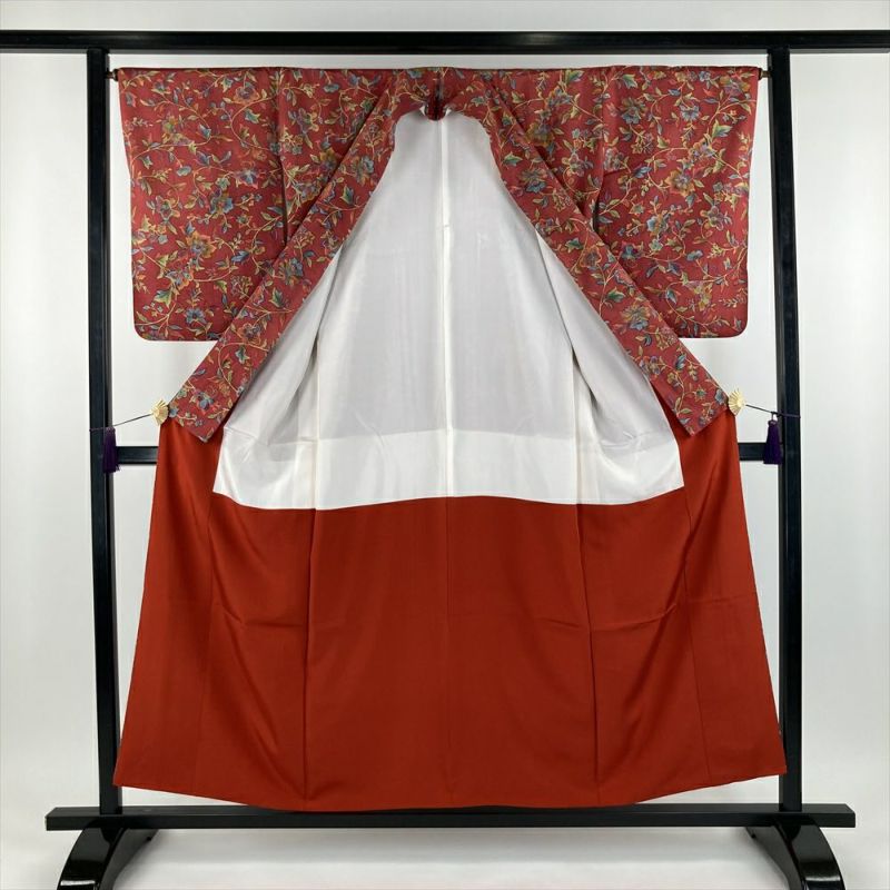 (中古) 小紋 赤色 カジュアル 紬地 染め 花蝶 オリエンタル 袷【身丈】151.5cm【裄丈】66cm