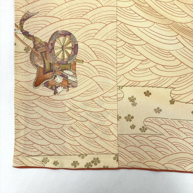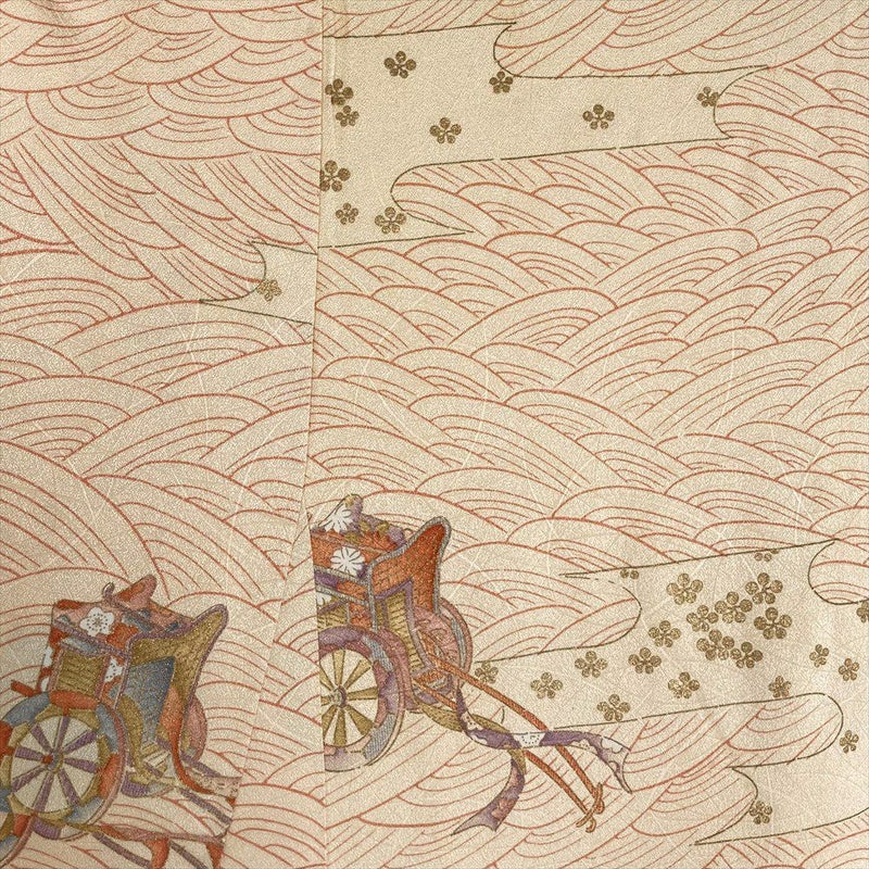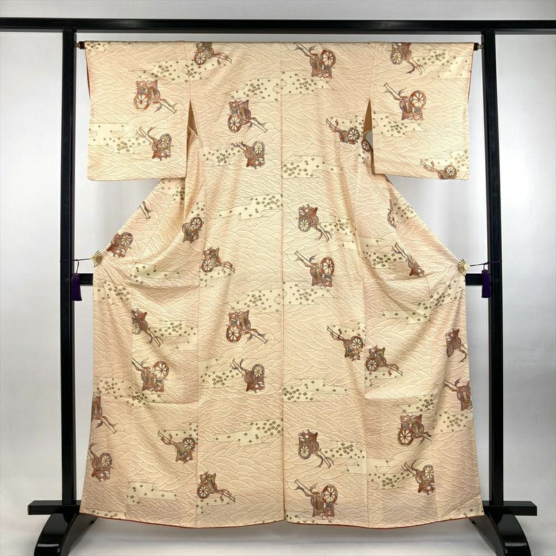 (中古) 小紋 卵色 オレンジ カジュアル 地紋織り 染め 金彩 御所車 流水 霞 袷 S【身丈】158.5cm【裄丈】65cm