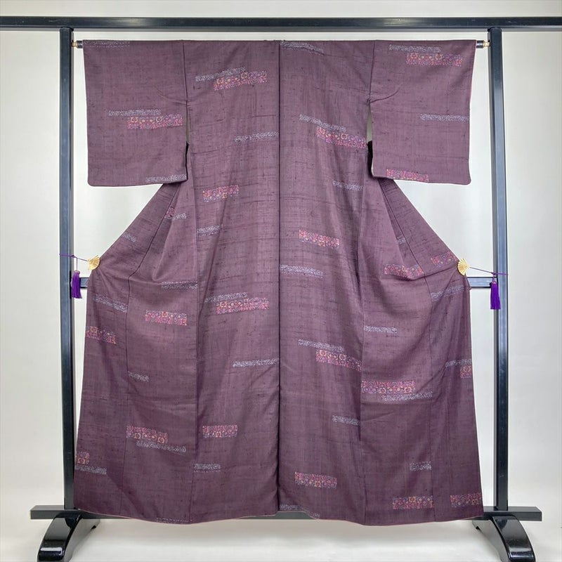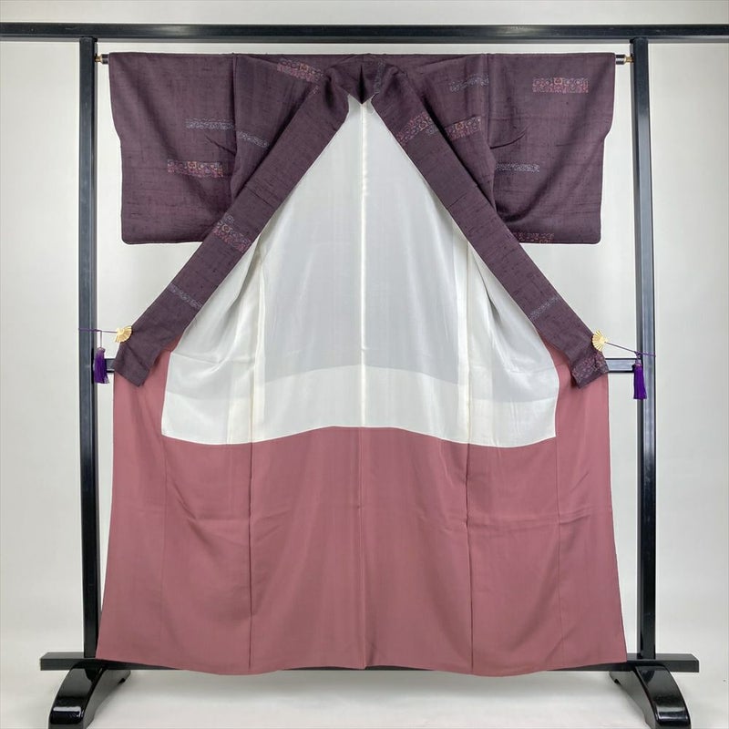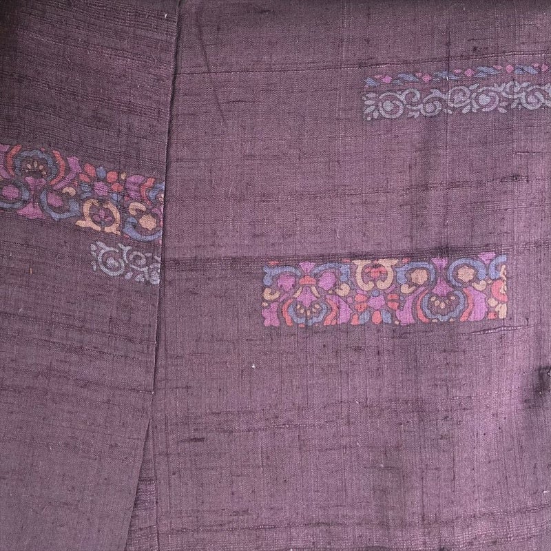 (中古)小紋 小豆色 紫 カジュアル 紬地 染め 花 蔓 オリエンタル模様 袷 S【身丈】156cm【裄丈】64cm