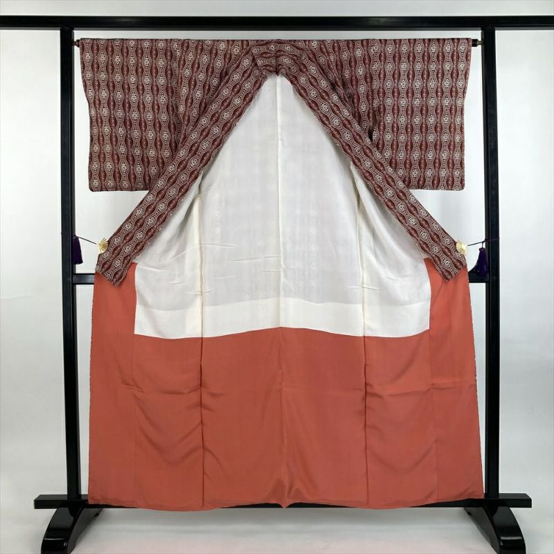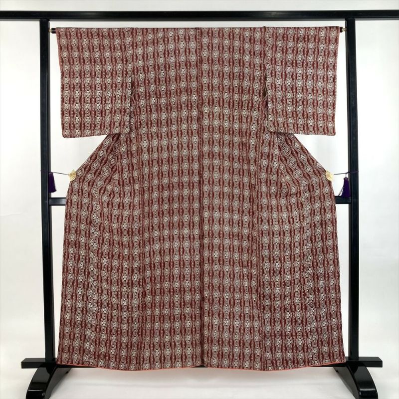 (中古)小紋 茶 カジュアル 地紋織り 立涌華文 袷 SS【身丈】154.5cm【裄丈】65.5cm