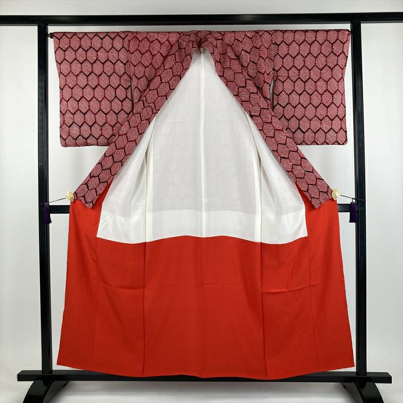 伝統的な技法で作られた鹿の子絞りの小紋は、日本の美を代表する着物の一つと言えるでしょう。一つ一つ手作業で染められた繊細な模様は、見る人を魅了し、着る人を美しく輝かせてくれます。赤色は、華やかで目を引く色ですが、亀甲文様の規則正しい模様が、その華やかさを引き締め、落ち着いた印象です。状態の良い美品。クリーニング済みで、すぐにご着用いただけます。この機会にぜひ。保存臭がややございます。