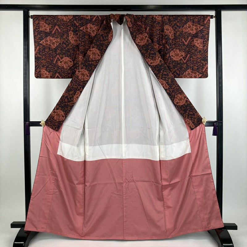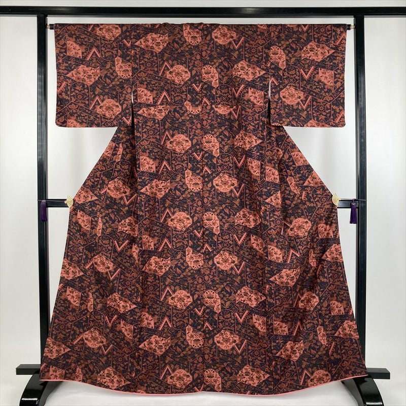 (中古) 小紋 紺 ピンク カジュアル 紬地 染め 更紗調 袷【身丈】159.5cm【裄丈】64.5cm