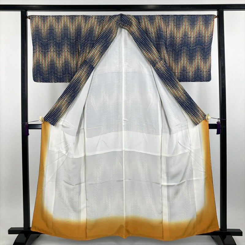 流れるような幾何学模様は、古典美と現代的な感性が融合した、飽きのこないデザインです。着物と帯の色を対比させることで、洗練された印象に。抽象画のようなモダンな柄の名古屋帯や、シンプルな無地の袋帯など、合わせる帯によって様々な表情を楽しめます。状態は良好で、目立つシミや汚れもなく、クリーニング済みです。すぐにご着用いただけます。保存臭がややございます。