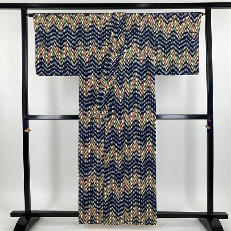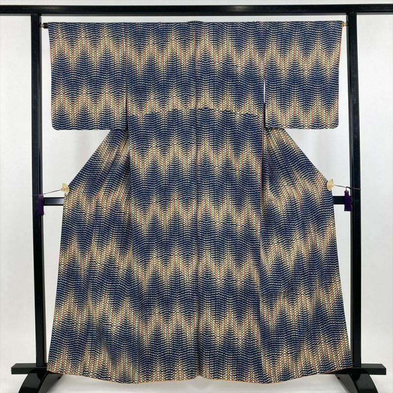 (中古) 小紋 群青色 カジュアル ちりめん 染め 幾何学 袷【身丈】154cm【裄丈】66cm