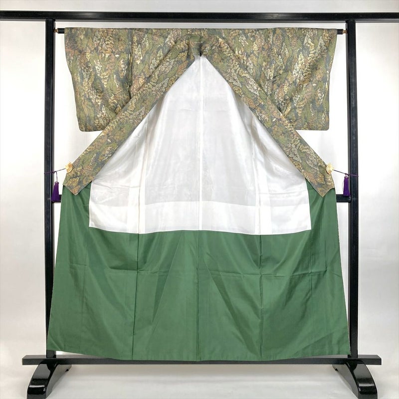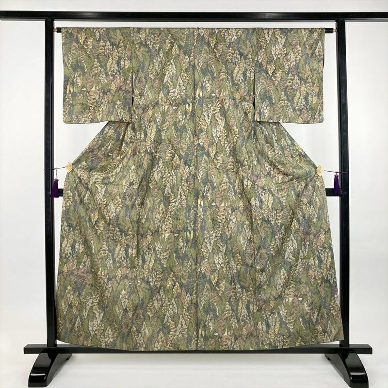 (中古) 小紋 緑 カジュアル 紬地 染め 木立 伊勢型調 袷 S【身丈】156cm【裄丈】63cm