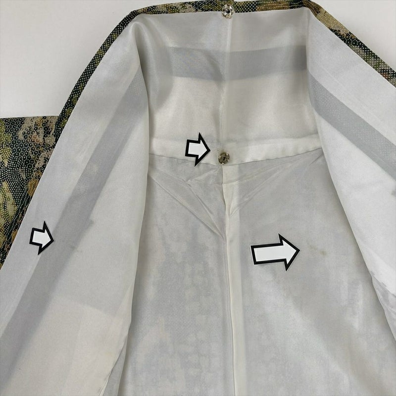 小紋は、柄を繋げず同じ柄が繰り返し染められています。 柄は大小あるものの一目見て分かる程度の大きさで、カジュアルなお出かけや柄付けによって少しおしゃれをしていきたい場面など巾広いシーンでお楽しみいただけます。衿裏、裏地にスナップ汚れがございます。保存臭がややございます。
