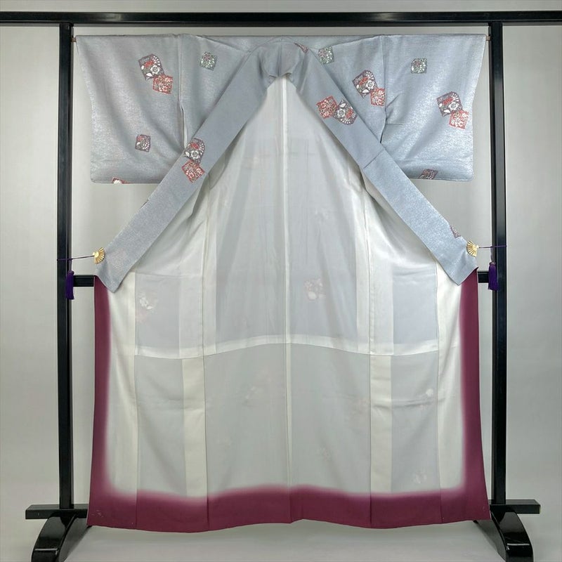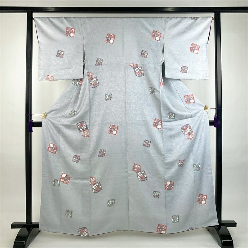 (中古)小紋 薄灰 グレー カジュアル 地紋織り 染め 色紙に草花 袷 S【身丈】158cm【裄丈】67cm