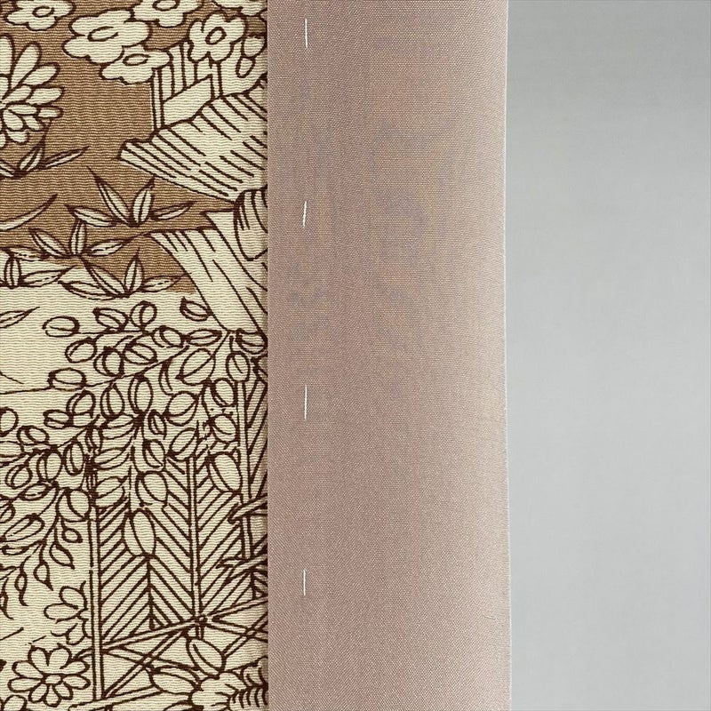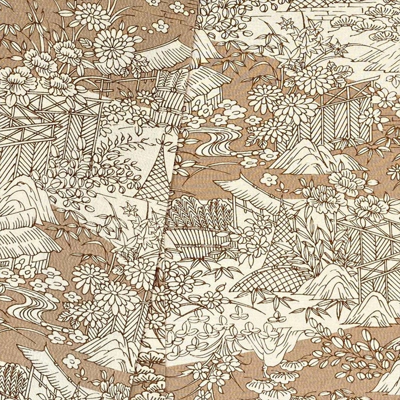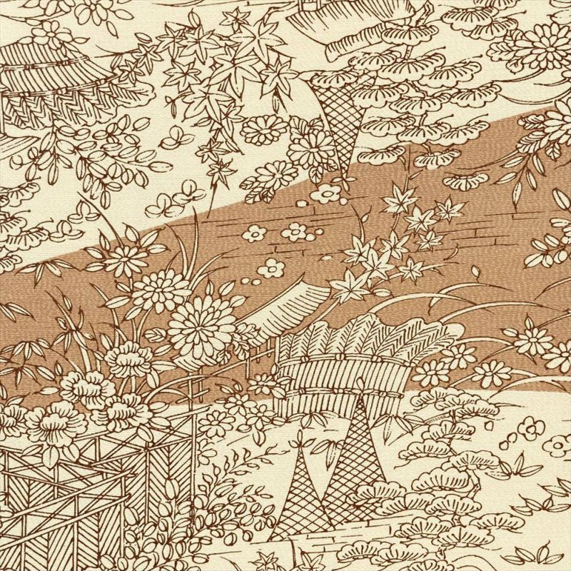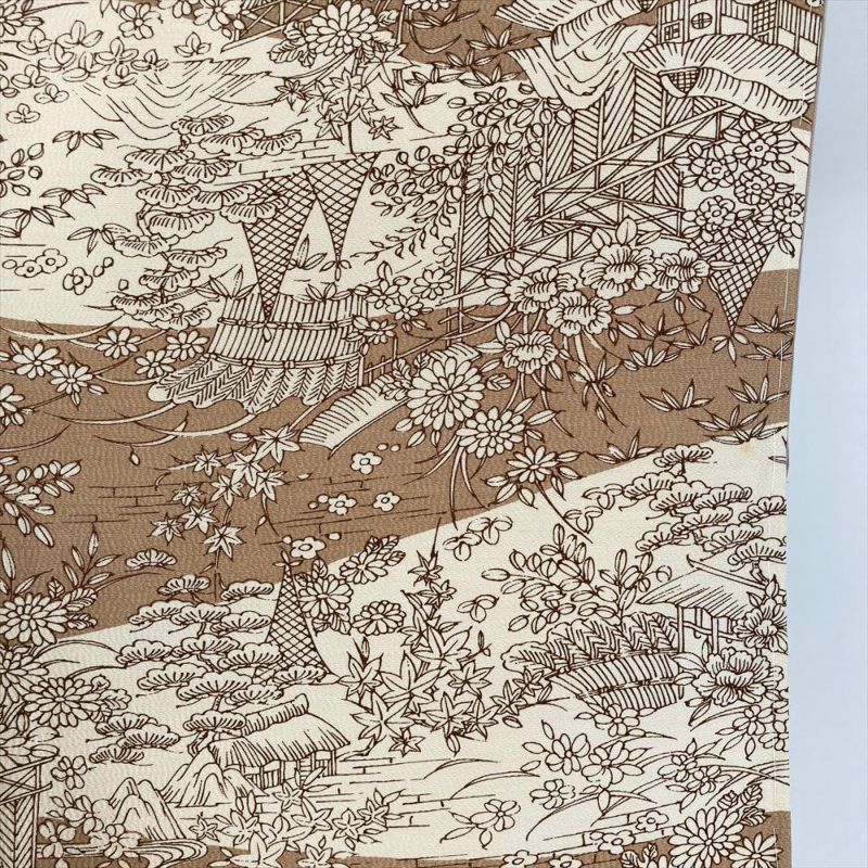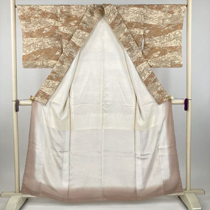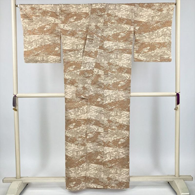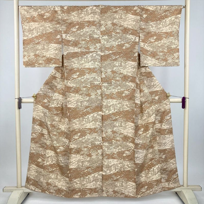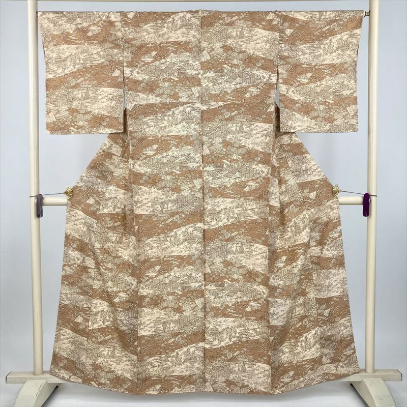 ベージュと黄土色の雲取りに型染めで茶屋辻風の景色を描いた小紋です。しつけもついた未使用品になります。