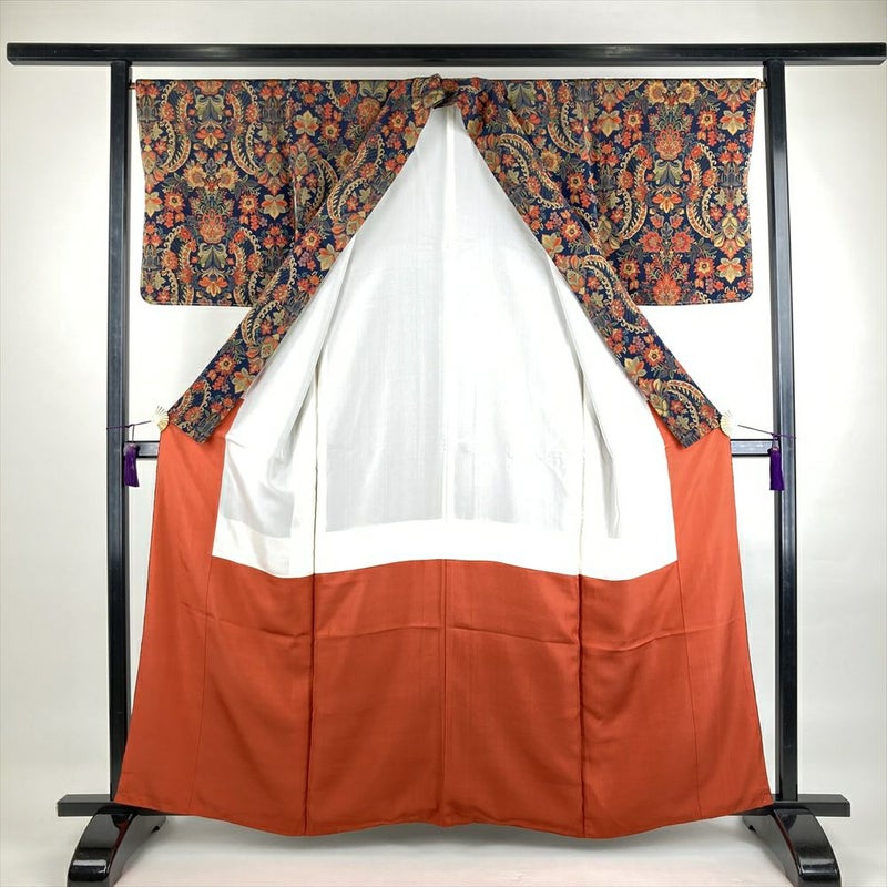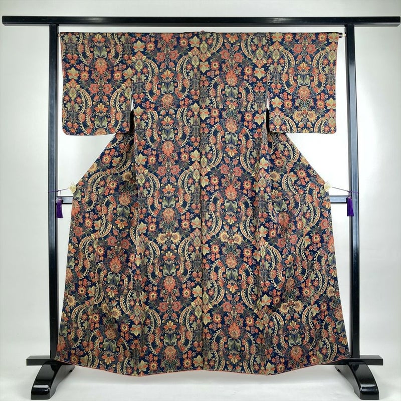 (中古)小紋 鉄紺 カジュアル ちりめん 染め 更紗 オリエンタル調 袷 SS【身丈】154.5cm【裄丈】66.5cm