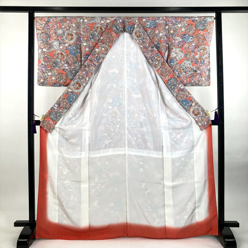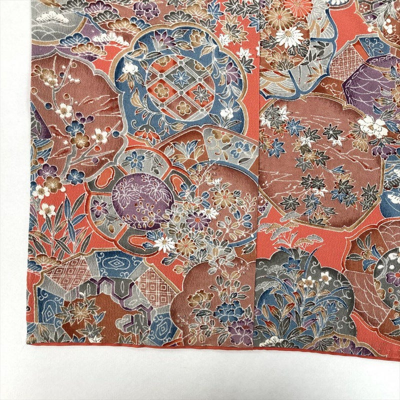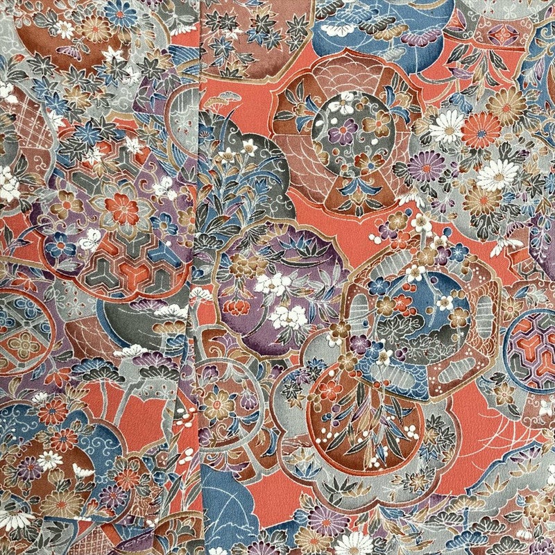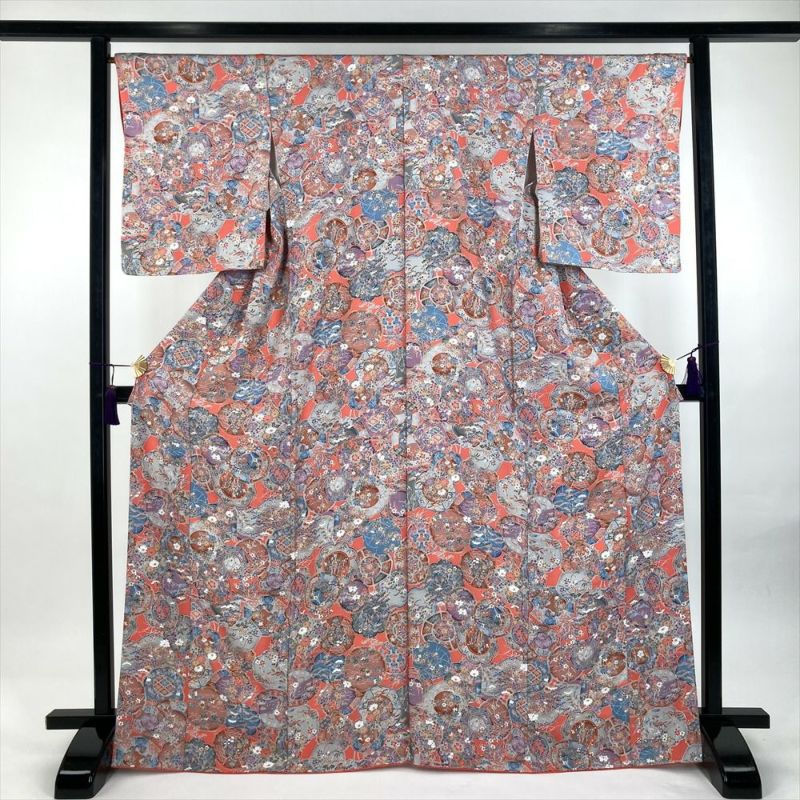 (中古) 小紋 濃珊瑚色 ピンク 紫 カジュアル ちりめん 染め 絵皿 四季花 袷 M【身丈】164cm【裄丈】67cm