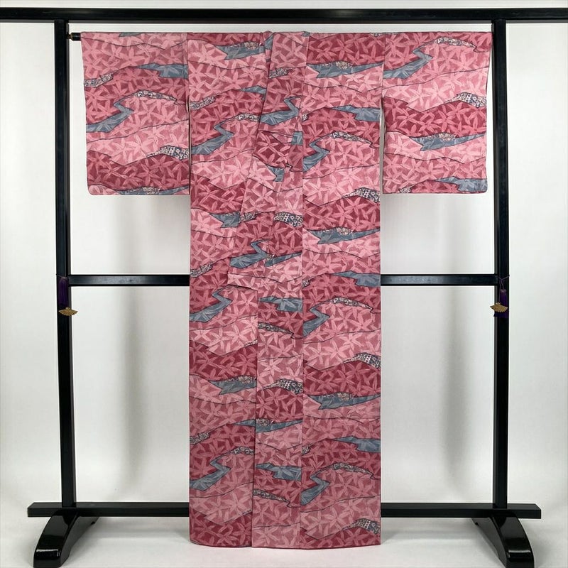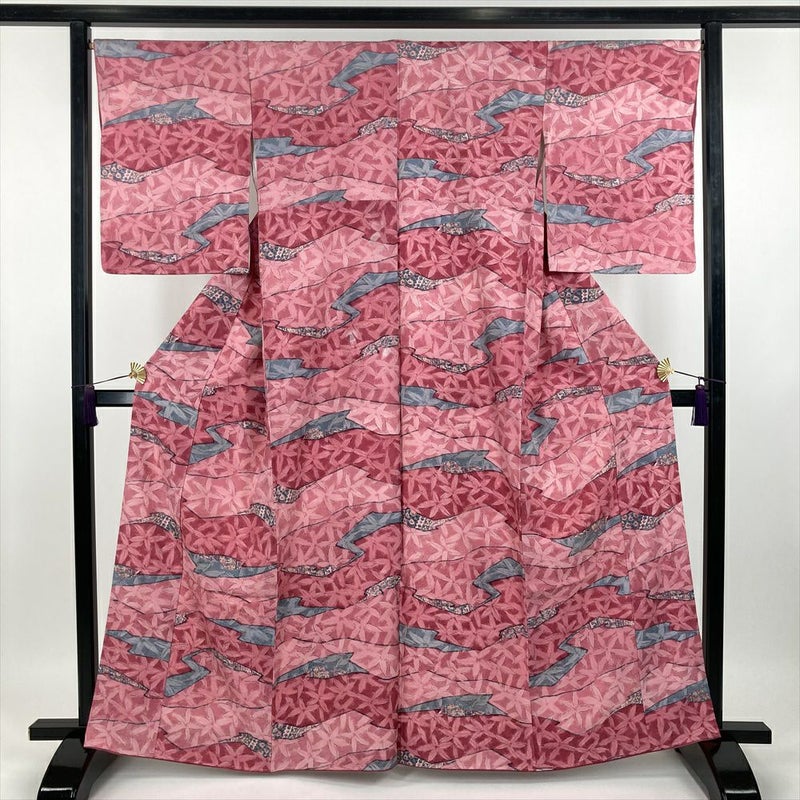 (中古) 小紋 濃ピンク色 カジュアル 地紋織り 抽象柄 袷【身丈】159cm【裄丈】67.5cm