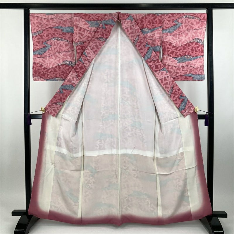 落ち着いたピンク色と、どこか懐かしいようなモダンな抽象柄が絶妙に調和した小紋です。普段使いから少し特別な日まで、幅広いシーンで活躍してくれるでしょう。目立つシミや汚れもなく、状態は良好です。クリーニング済みで、すぐにご着用いただけます。この機会にぜひ、お見逃しなく!保存臭がややございます。しつけあり