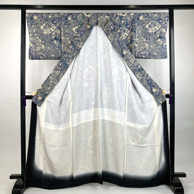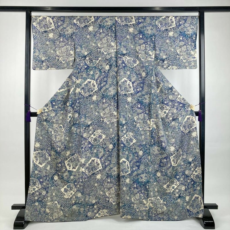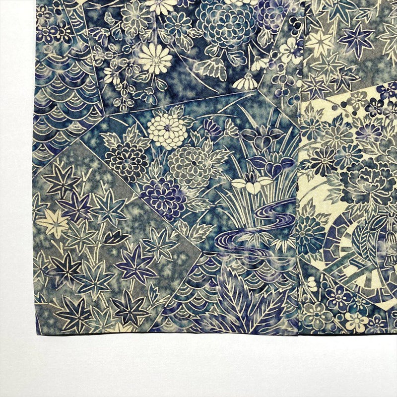 (中古)小紋 藍色 青 カジュアル 染め 切り嵌め 四季の草花 花車 青海波 袷 S【身丈】159cm【裄丈】68cm