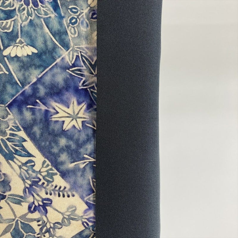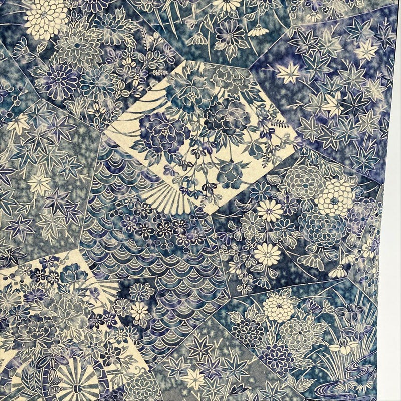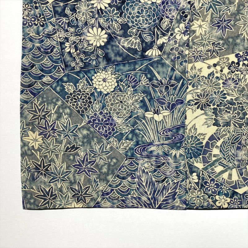 【色柄】藍色 青 カジュアル 染め 切り嵌め 四季の草花 花車 青海波