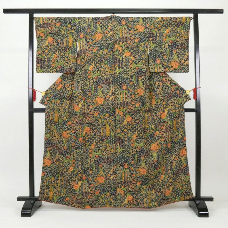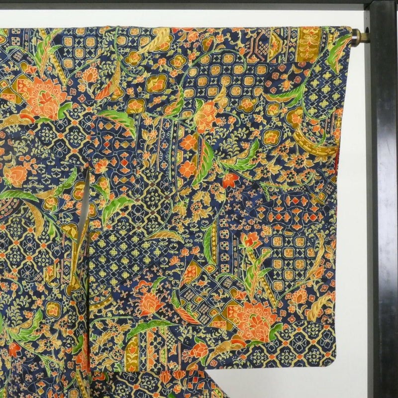 (中古)小紋 紺地 更紗 型染 袷 M【身丈】160.5cm【裄丈】67.5cm