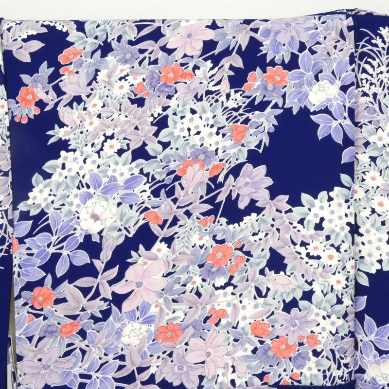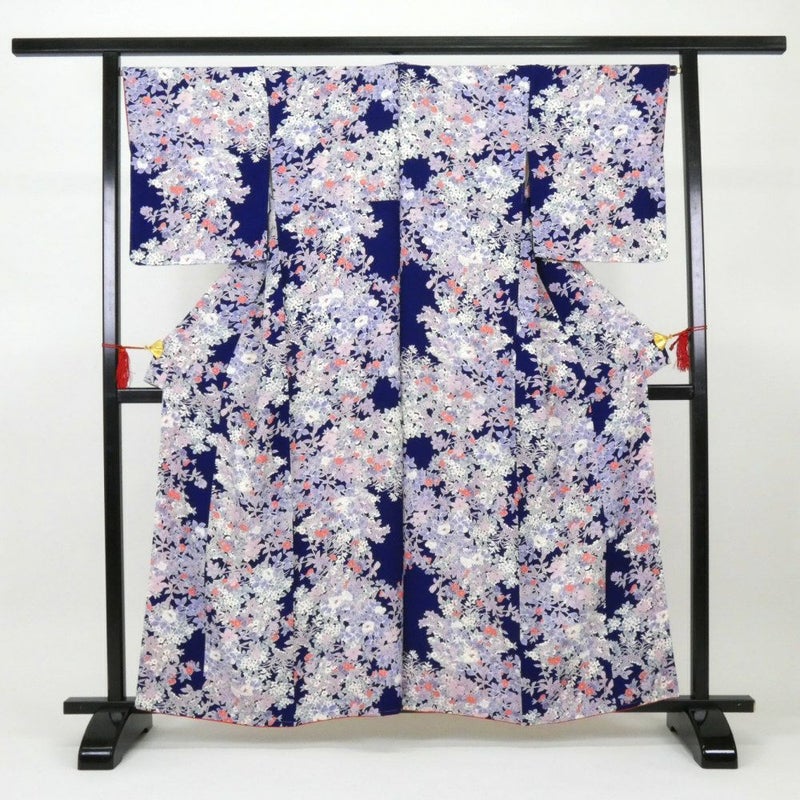 紺地に白く縁どられた草花が淡く描かれた小紋です。オレンジの花がアクセントになっています。画像では見えないのですが、衿裏にはアクが残っていますが着用には支障がありません。保存臭もなく状態は悪くありません。