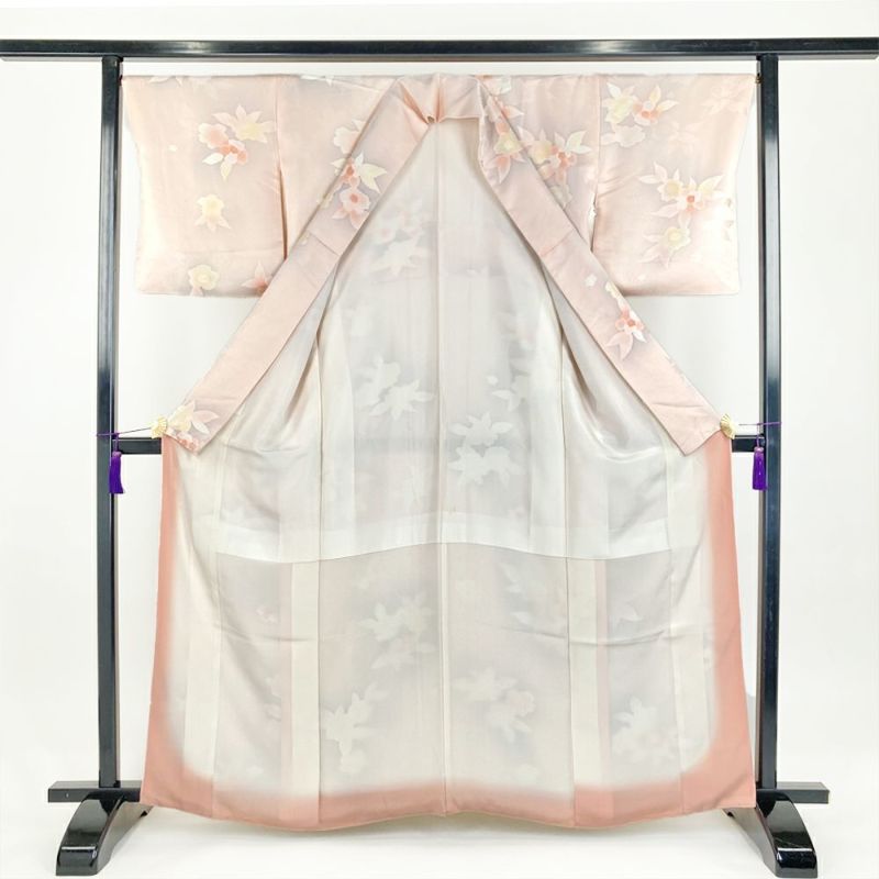 (中古)小紋 桜色 ピンク カジュアル 地紋織り 染め 椿 袷 S【身丈】156.5cm【裄丈】67cm