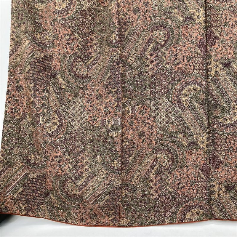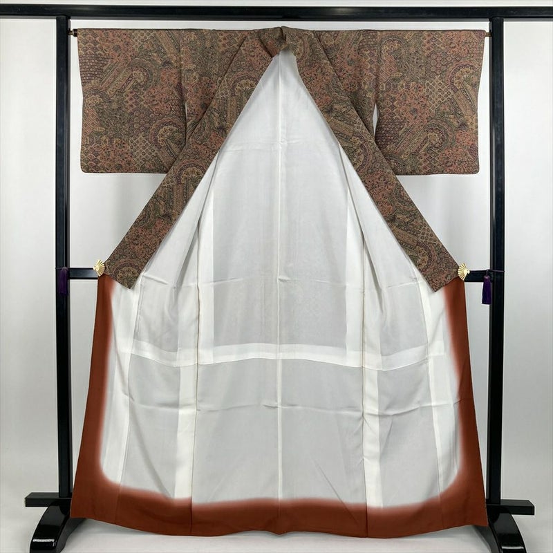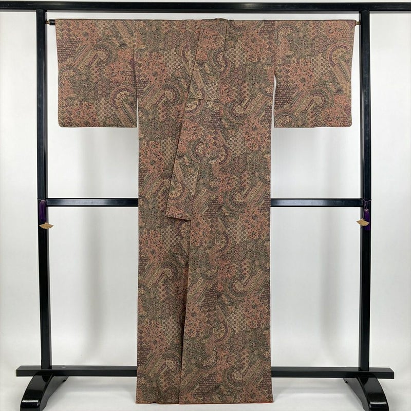 (中古) 小紋 茶色 カジュアル ちりめん 染め 更紗調 袷【身丈】160.5cm【裄丈】66cm