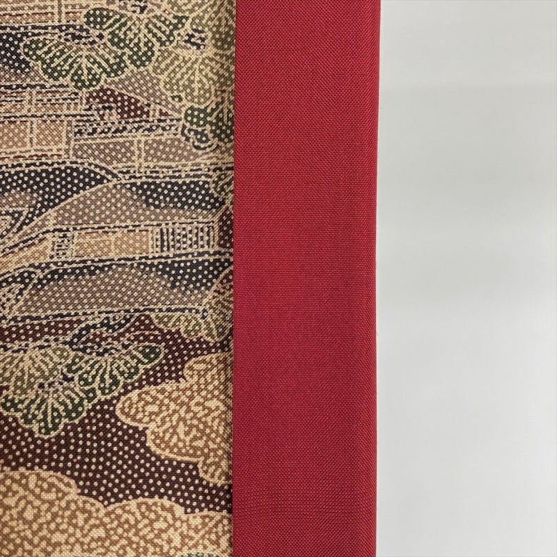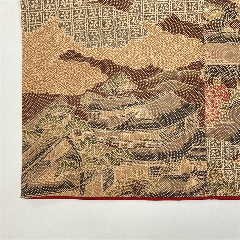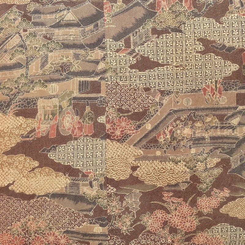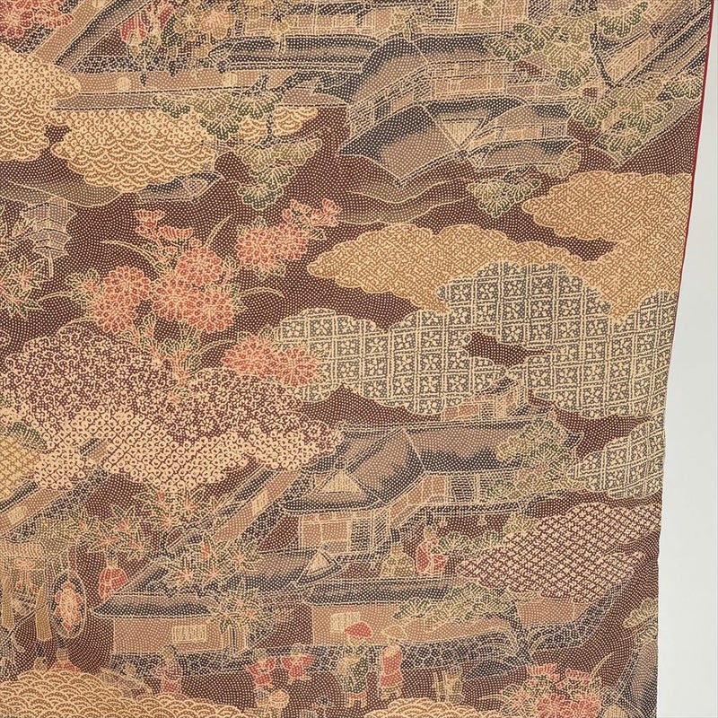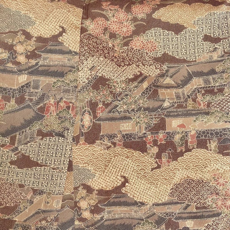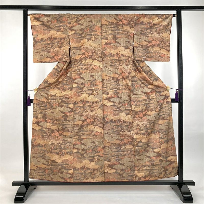 【色柄】茶 カジュアル 紬地 染め 洛中洛外図 伊勢型調
