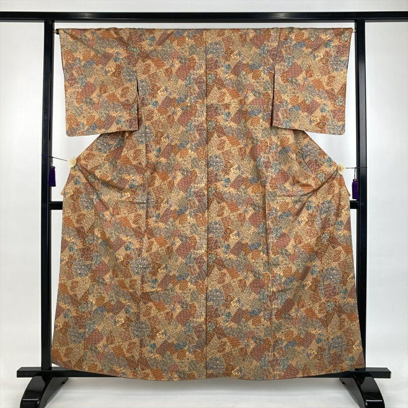 (中古)小紋 薄橙 オレンジ カジュアル 紬地 染め 御帳 四季花 オリエンタル 袷 S【身丈】157cm【裄丈】67.5cm
