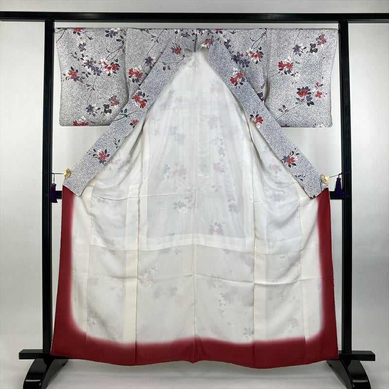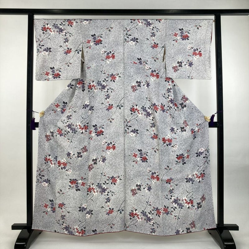 (中古) 小紋 白 青 グレー カジュアル ちりめん たたき染め 金彩 わらし 椿 袷 S【身丈】156.5cm【裄丈】67cm