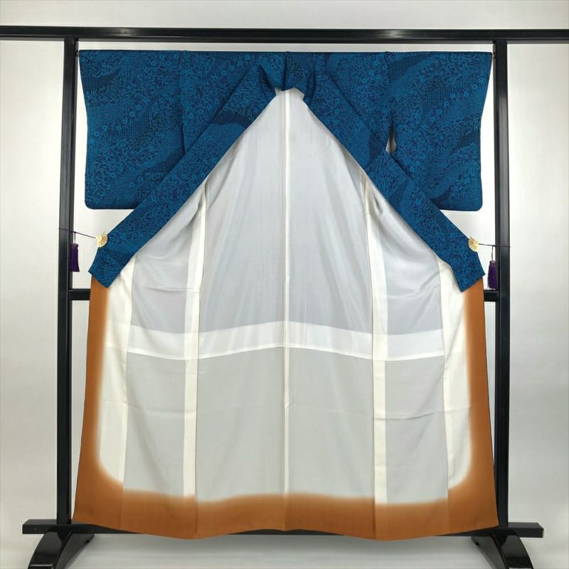 (中古)小紋 紺 シアン カジュアル ちりめん 型絵染め 道長取り 植物 吉祥文 袷 SS【身丈】154cm【裄丈】67cm