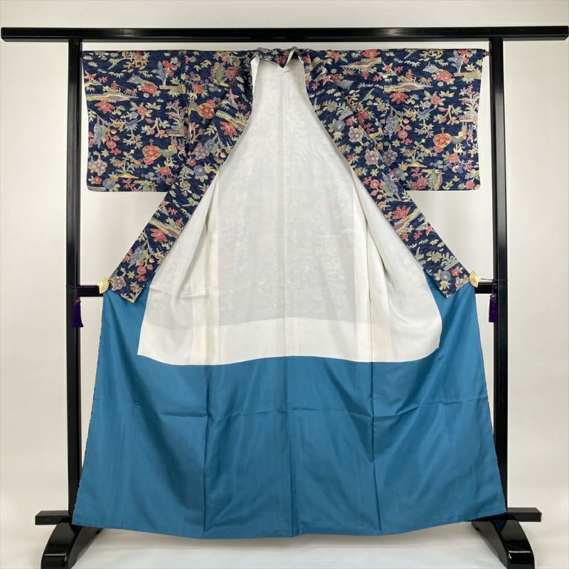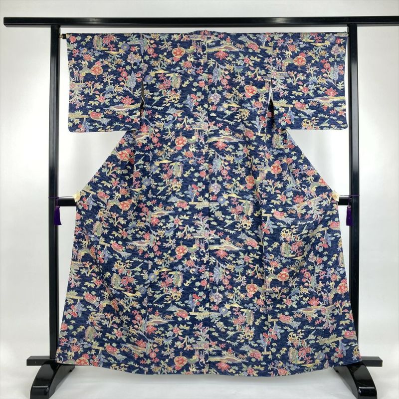 (中古)小紋 紺 カジュアル 地紋織り 染め 動物 人間 オアシス オリエンタル 袷 S【身丈】155.5cm【裄丈】66cm