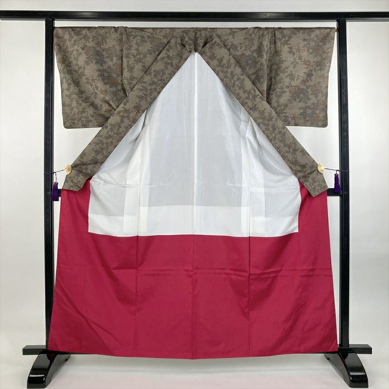 (中古) 小紋 薄焦げ茶 カジュアル 紬地 染め 花鳥 袷 S【身丈】159cm【裄丈】69cm