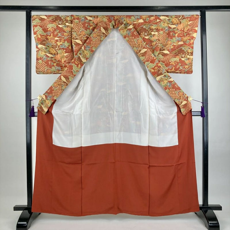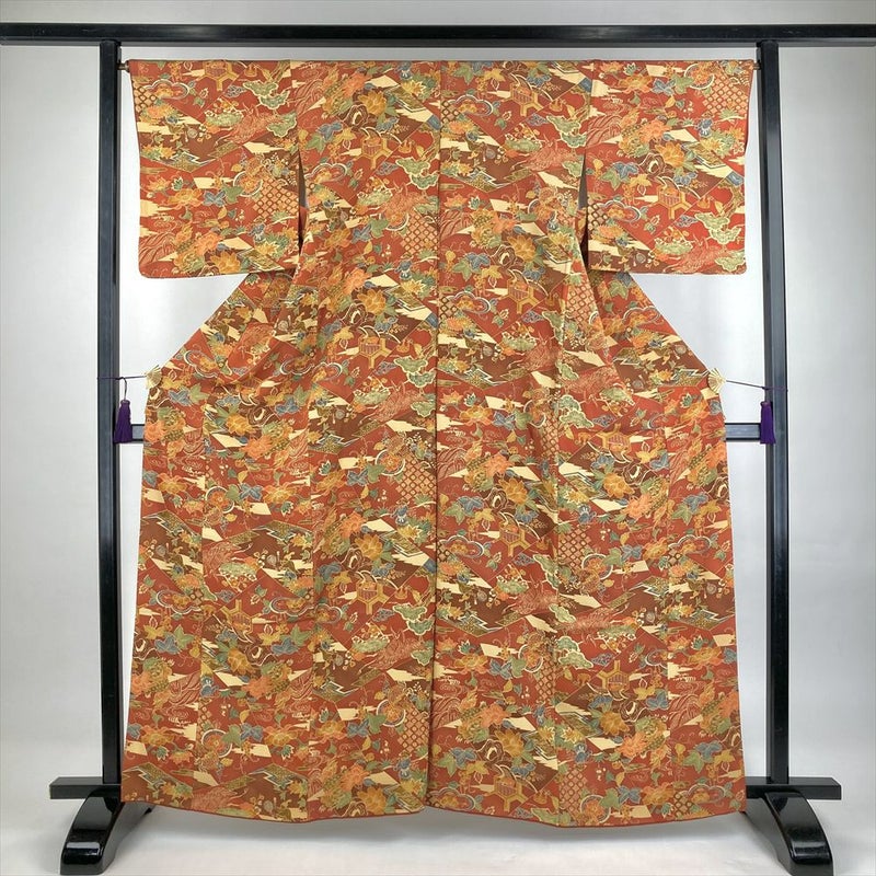 (中古)小紋 柿色 カジュアル ちりめん 染め 切り嵌め 鳥 獅子 人物 四季花 袷 S【身丈】159cm【裄丈】67cm