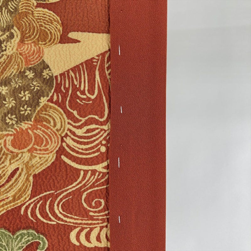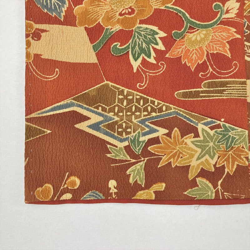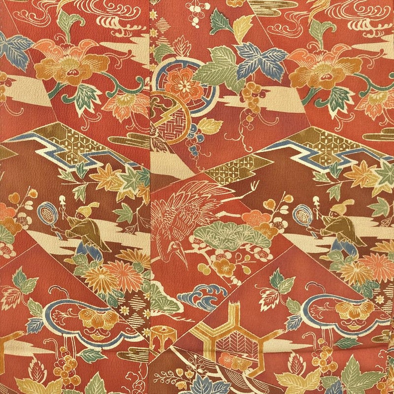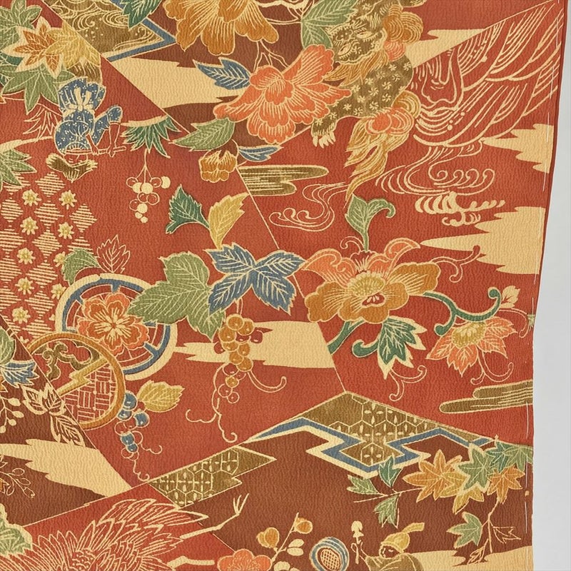 【色柄】柿色 カジュアル ちりめん 染め 切り嵌め 鳥 獅子 人物 四季花