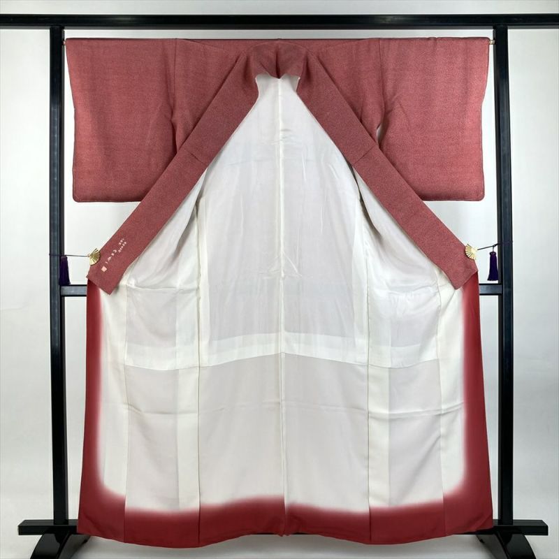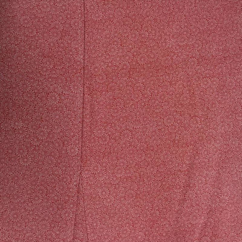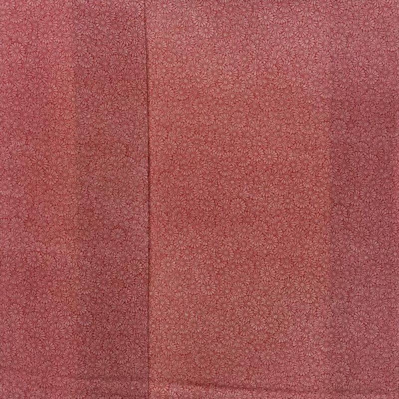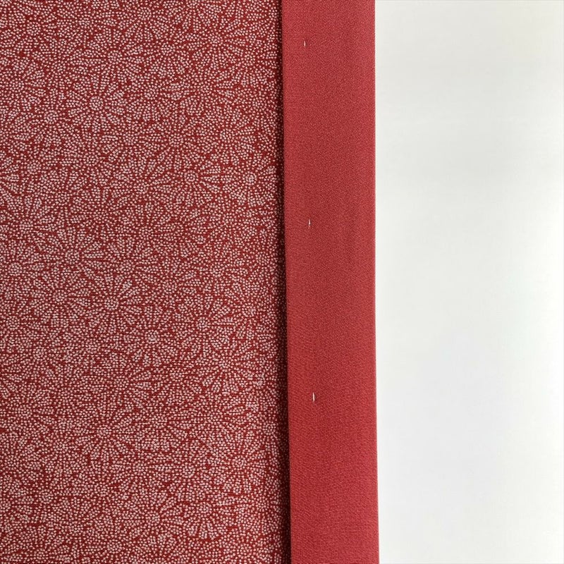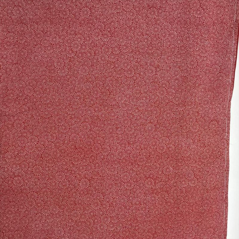 赤地に菊尽くしの江戸小紋です。プリント柄で手触りはさらっとしています。お稽古やお出かけなどカジュアルなシーンでお召しいただけます。落款あります。下前に生地の擦れが見られますが、着用には問題のない程度と思われます。しつけあります。