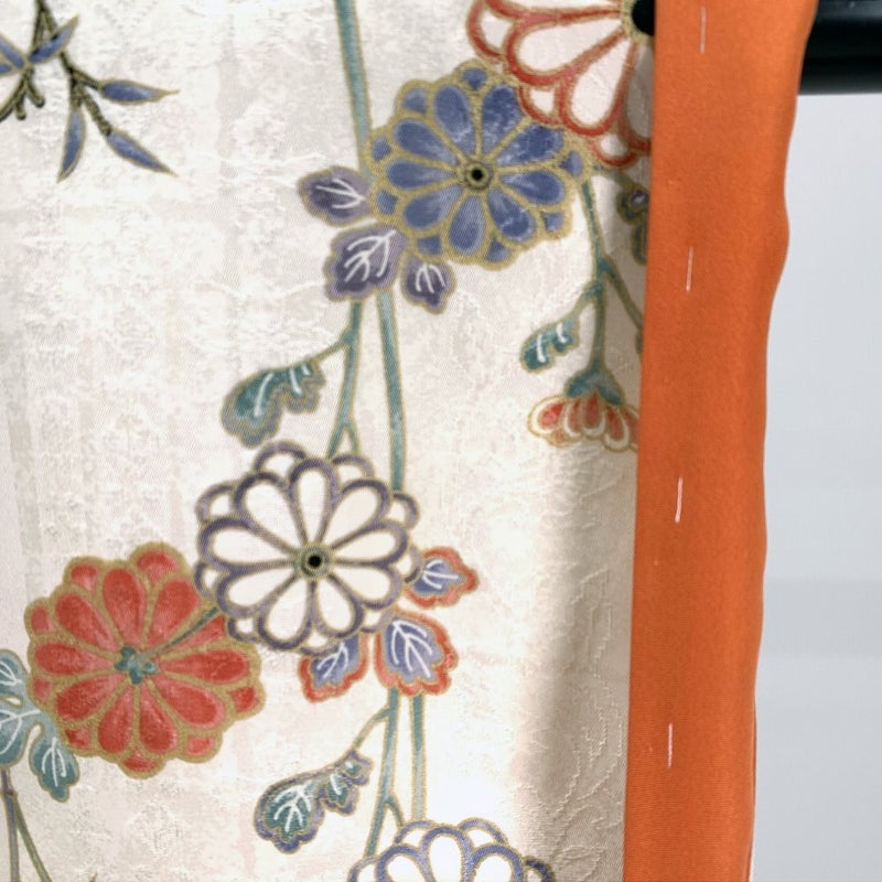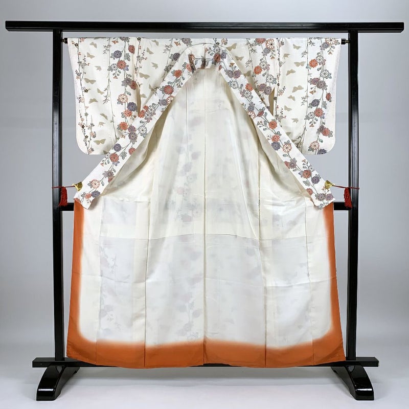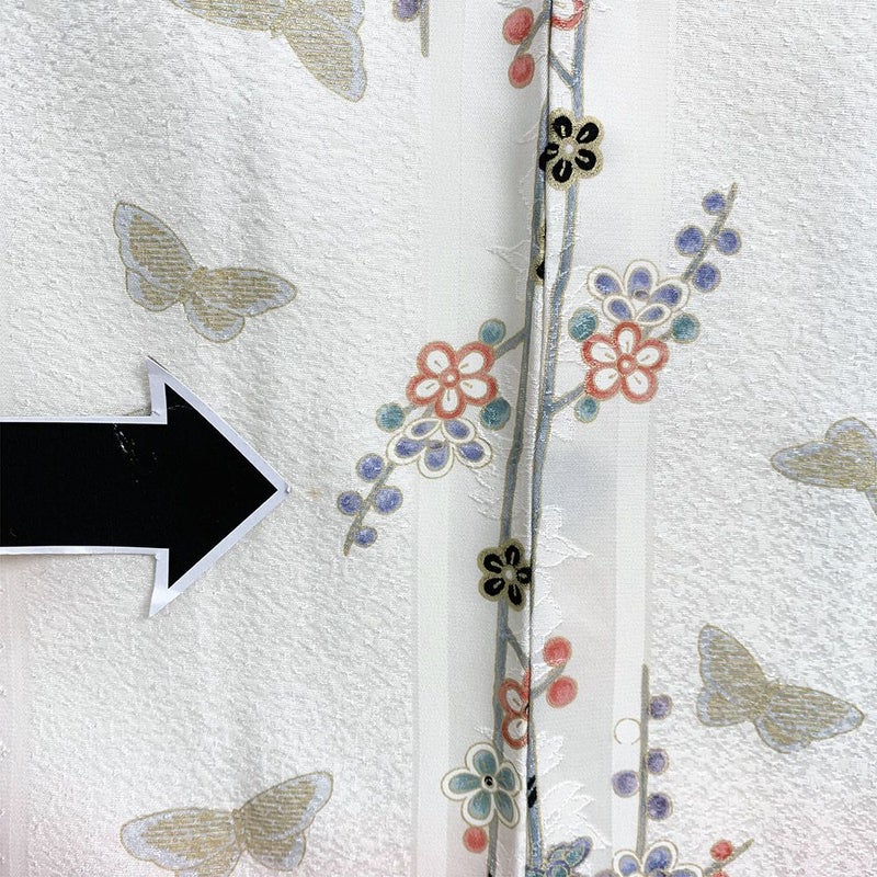 アイボリーの地紋織りに、蝶や花が描かれたお洒落で可愛い小紋です。お稽古やお出かけなどカジュアルなシーンでお召しいただけます。右後ろ身頃に小さな茶色い汚れが見られますが、着用には問題のない程度と考えられます。