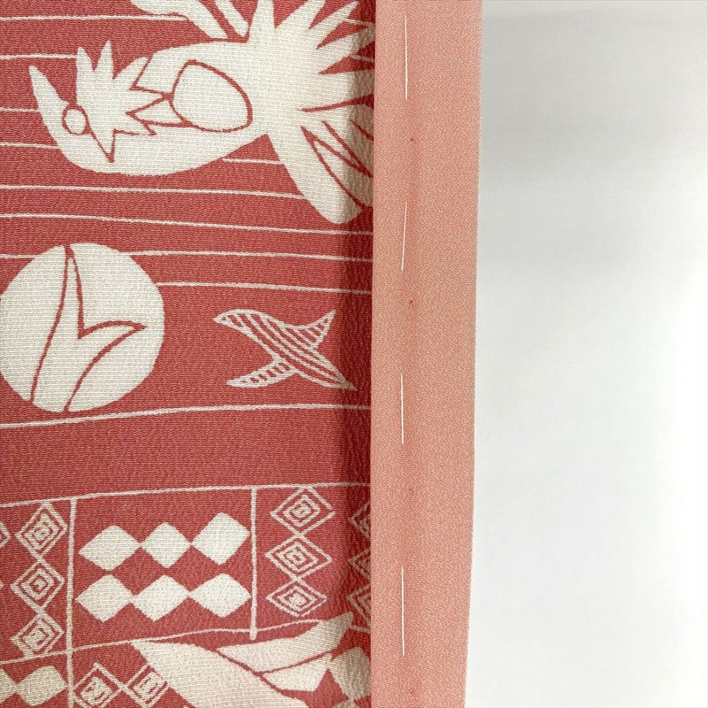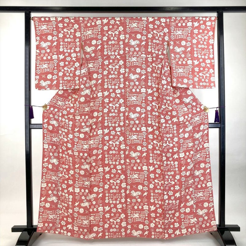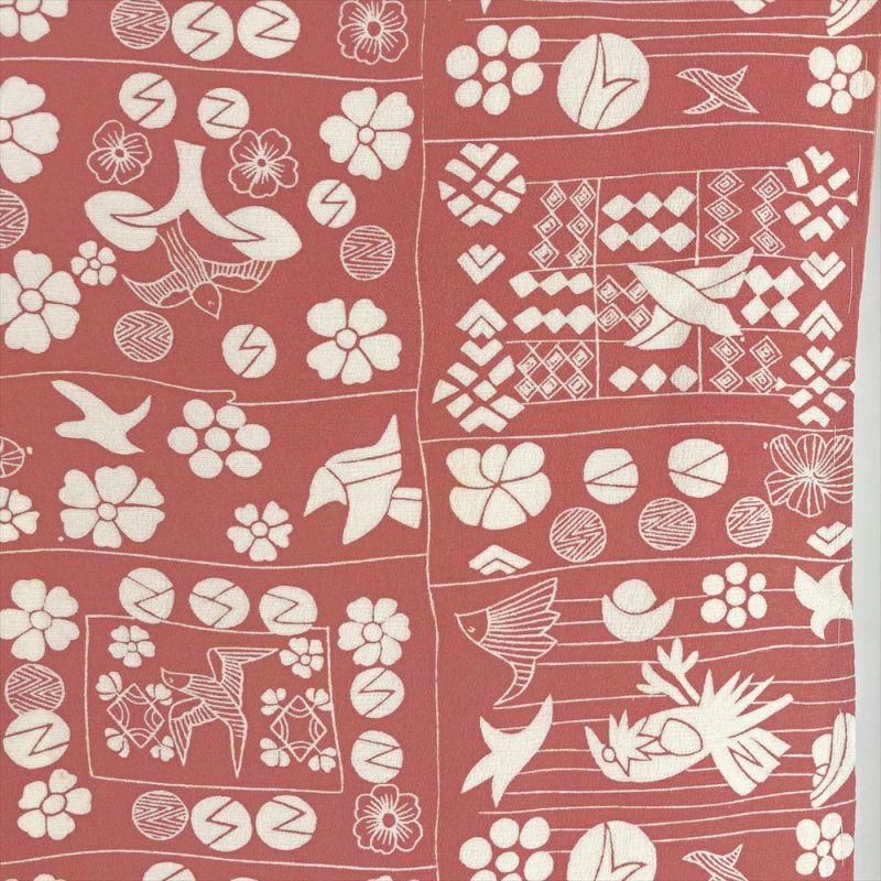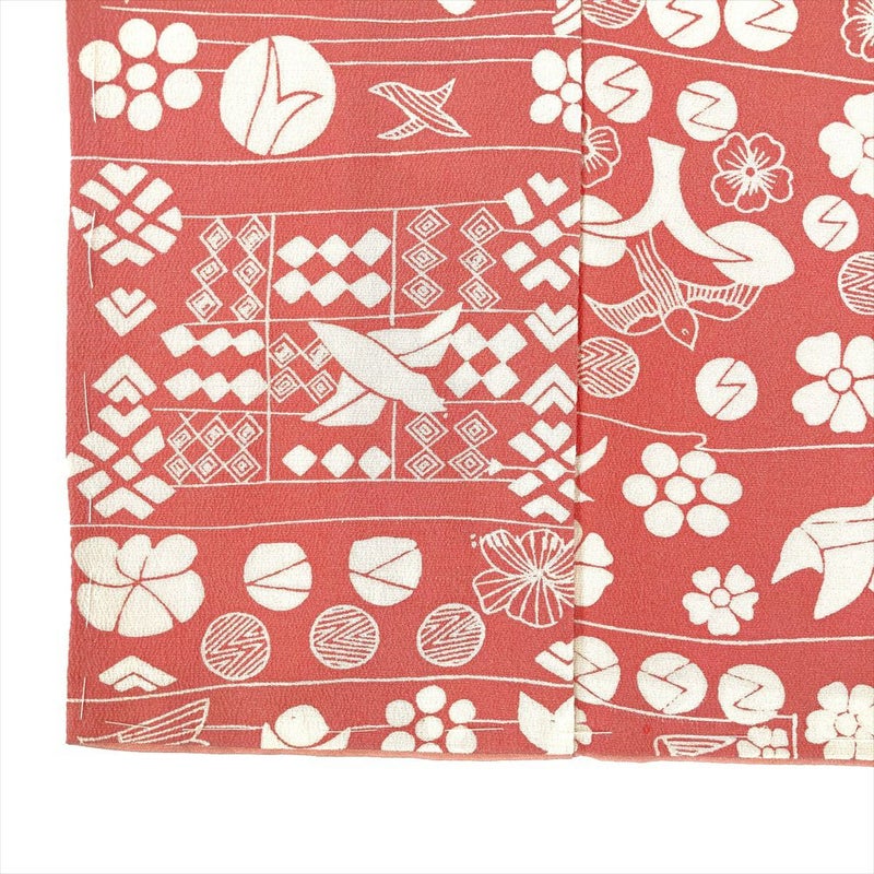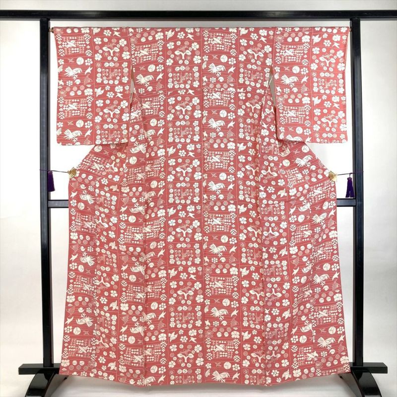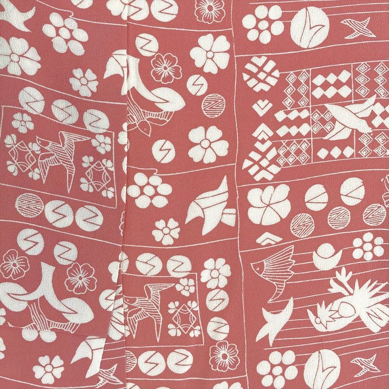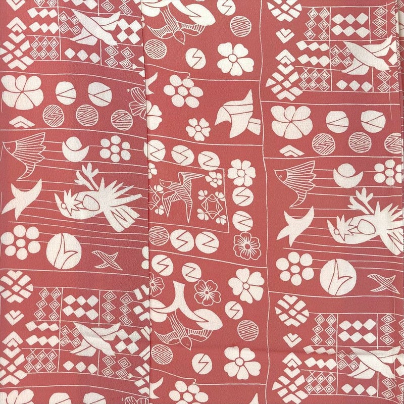 (中古)小紋 カジュアル ピンク 袷 鳥 総柄 花 古典柄 ちりめん M【身丈】161.5cm【裄丈】67.5cm