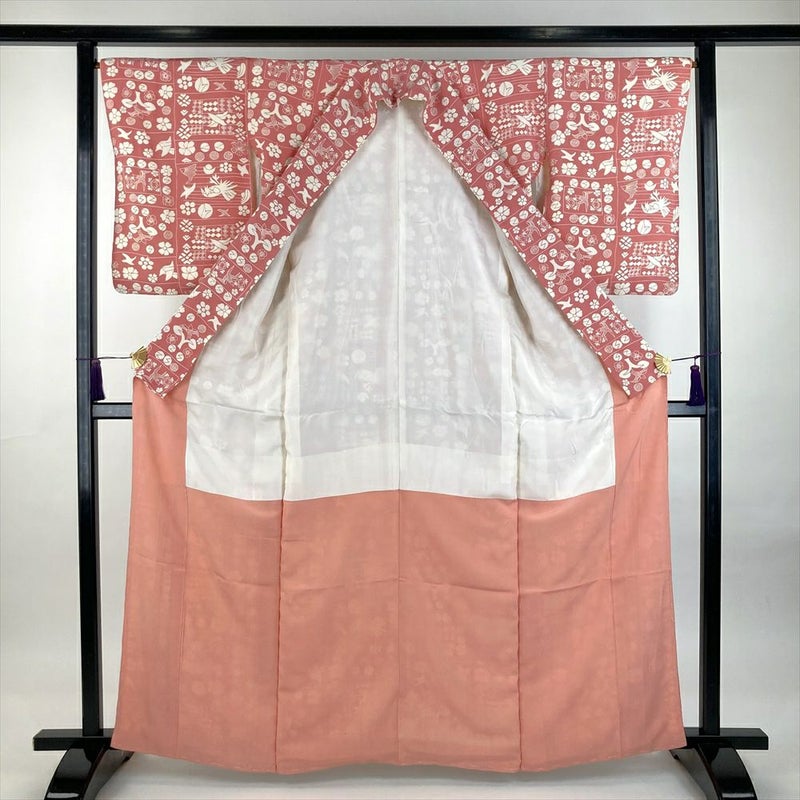 ピンクのちりめん地に古典柄がデザインされた小紋です。お稽古やお出かけなどカジュアルなシーンでお召しいただけます。後ろ身頃の白地の部分にやや黄変がみられます。上前の裾にシミがございますが、着用には問題のない程度と思われます。衿引き糸、しつけ糸あります。