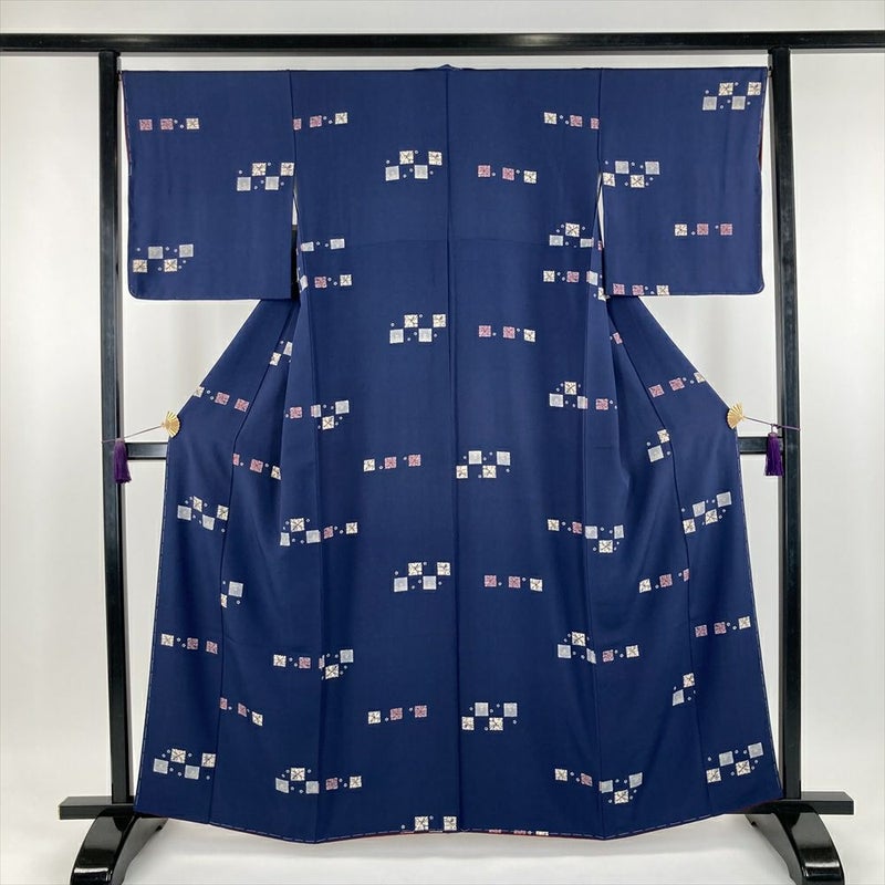 (中古)小紋 カジュアル 紺 袷 飛び柄 小花 S【身丈】157.5cm【裄丈】70.5cm