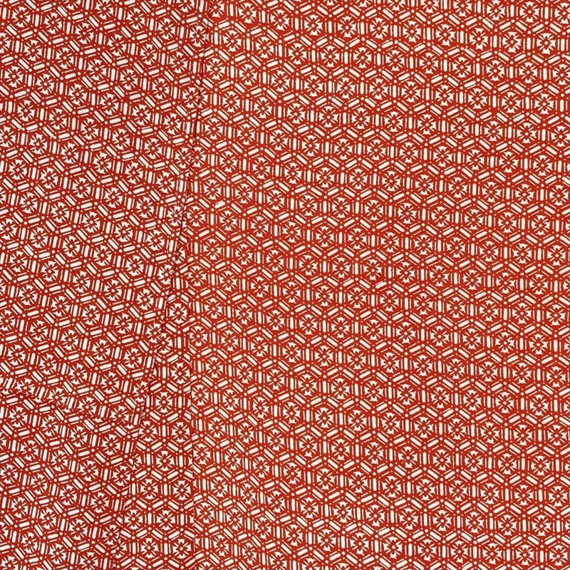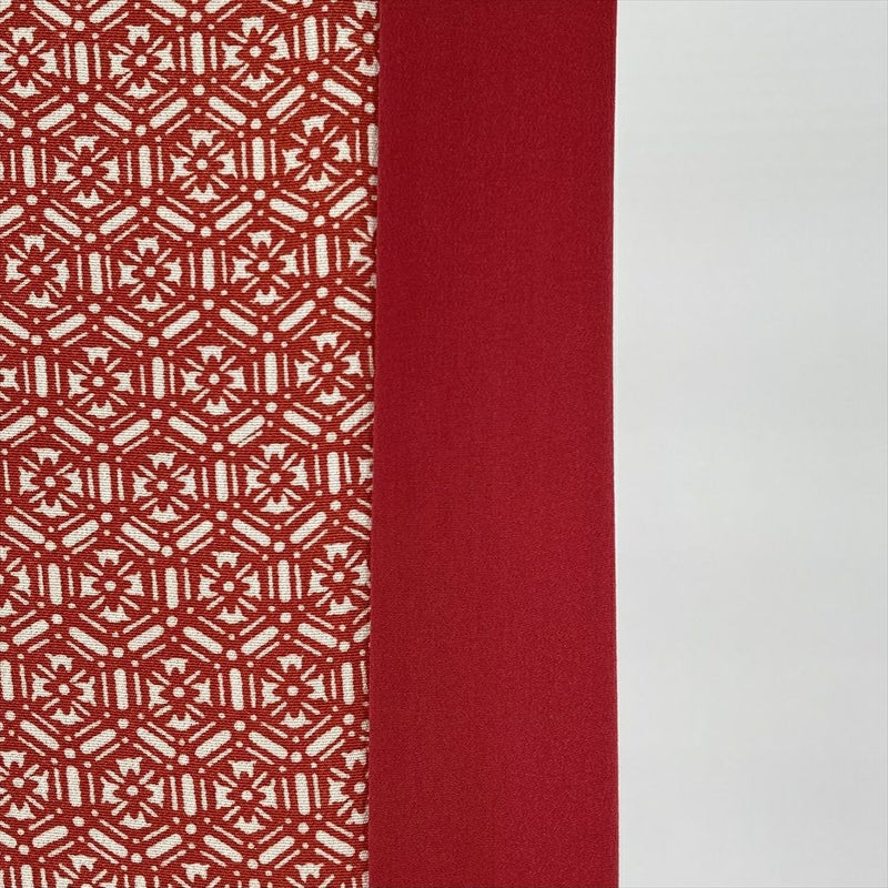朱を帯びた赤地に、格調ある亀甲華文を配した一着。