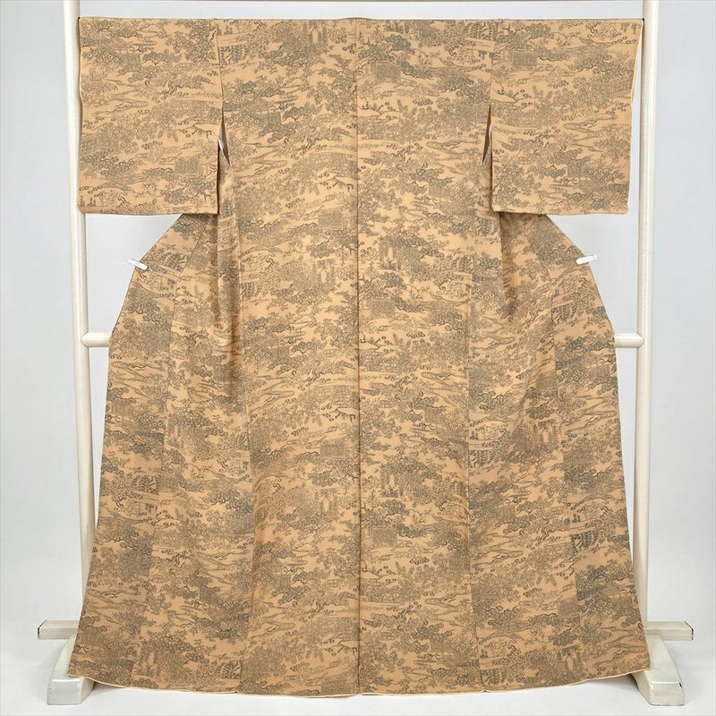 (中古) 小紋 飴色 イエローベージュ カジュアル 縮緬 風景文 袷 絹 【身丈】161cm【裄丈】69cm