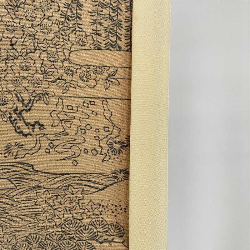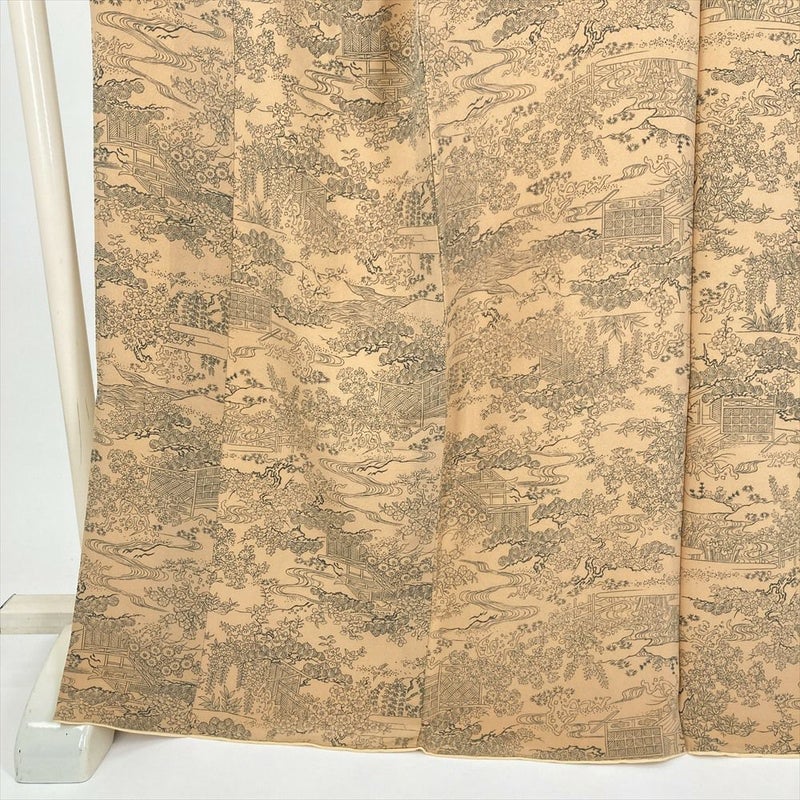 飴色の縮緬地に、趣ある風景文を染め上げた小紋です。