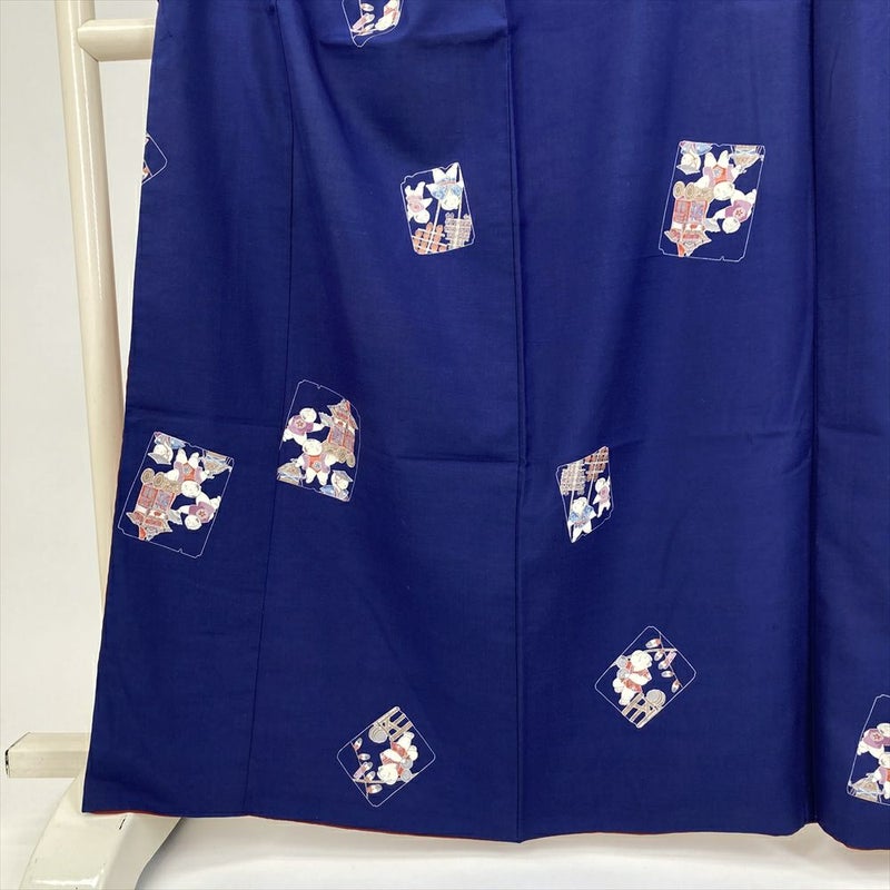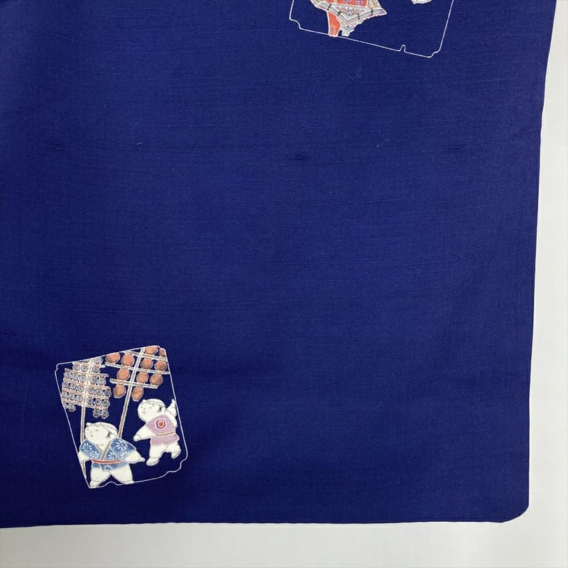 紺の紬地に童や日本の祭りを描いた遊び心あふれる小紋。